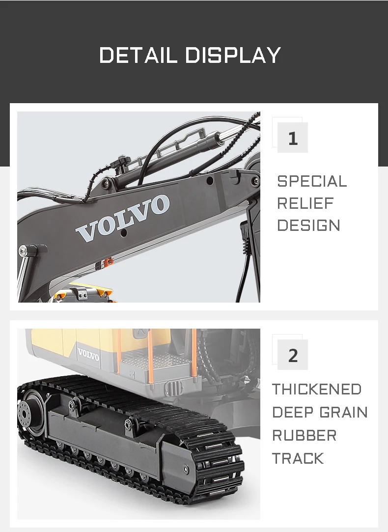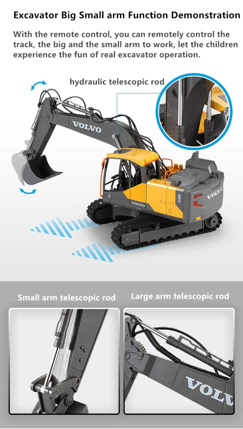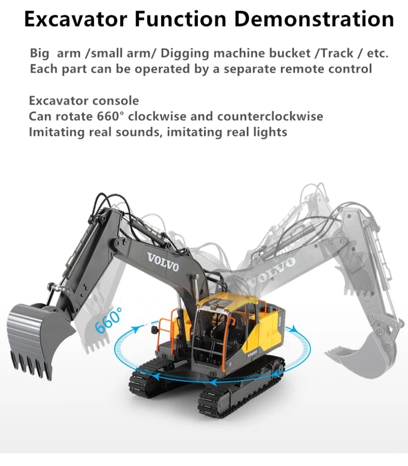 The remote control console rotates 660 Ì», the big and small digging arms can independently control the rise / fall, and the digging bucket can dig / unload;
