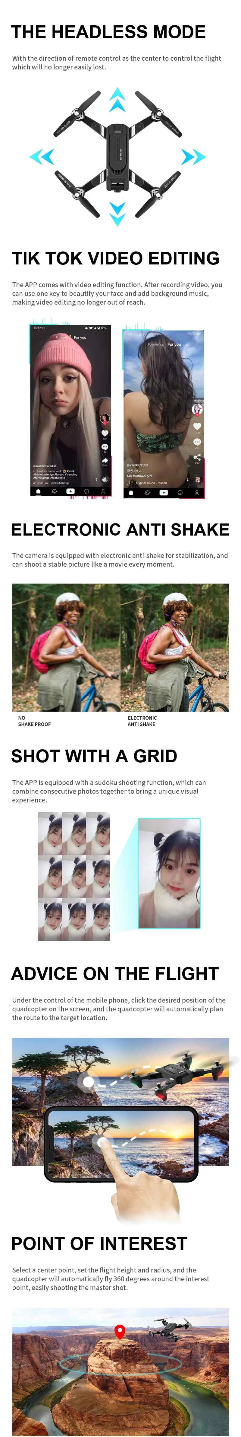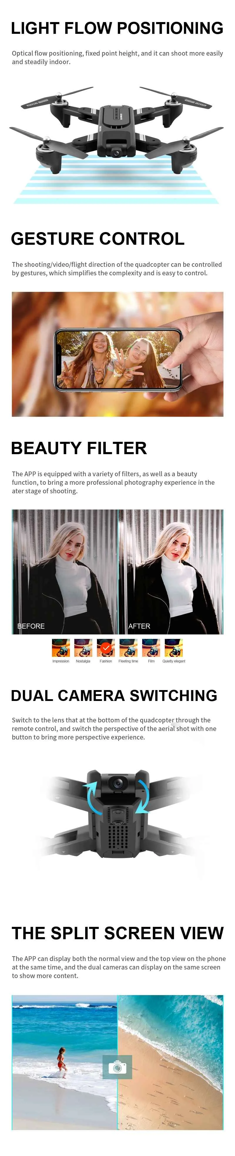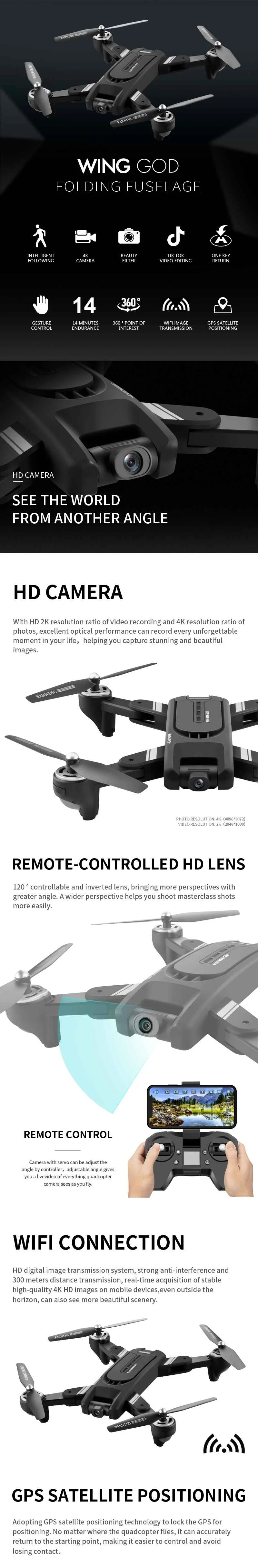 Function: GPS Positioning, Optical Flow, Dual camera, APP characters follow mode, Gesture to take pictures/video, Waypoint Flight, Point of Interesting Flight, Headless Mode, One Key to Return, Raise & Down, Forwards & Backwards, Left & Right Turning, Left & Right Flying, Hovering