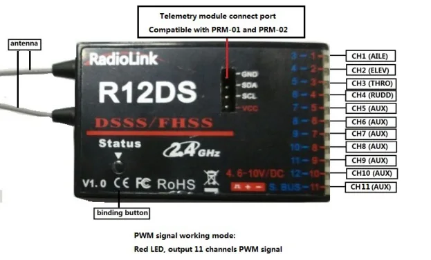 Radiolink R12DS, 2.4G 12 channels receiver, DSSS and FHSS spread spectrum working synchronously, compatible with Radiolink transmitters AT9, AT9S, AT10 and AT10II(AT9, AT9S, AT10 and AT10II can upgrade to 12 channels just upgrade by firmware, you can download the firmware from our website: