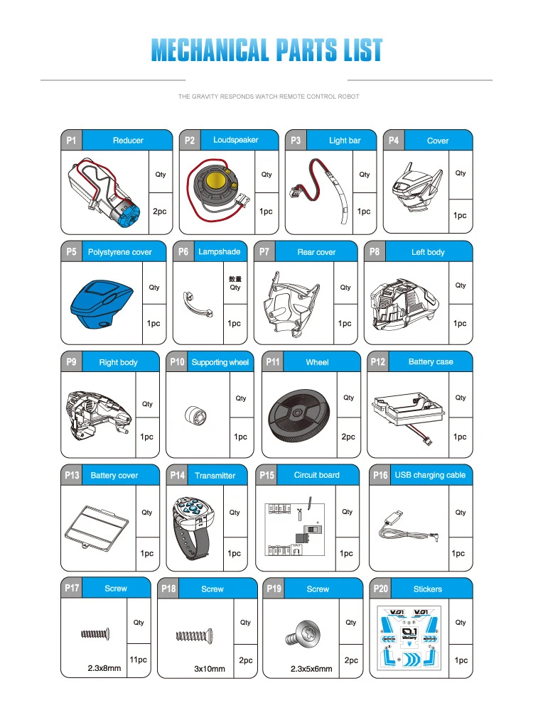 reducer 2, speaker 1, lamp 1, face cover 1, benzol cover 1, lamp cover 1, rear cover 1, left body 1, right body 1, support wheel 1, wheel 2, battery box 1, battery cover 1, watch remote controller 1, circuit board 1, 3.7V USB line 1, 2.3*8mm screw 11, 3*10mm screw 2, 2.3*6mm screw 2, sticker 1, instruction book 1 One screwdriver.