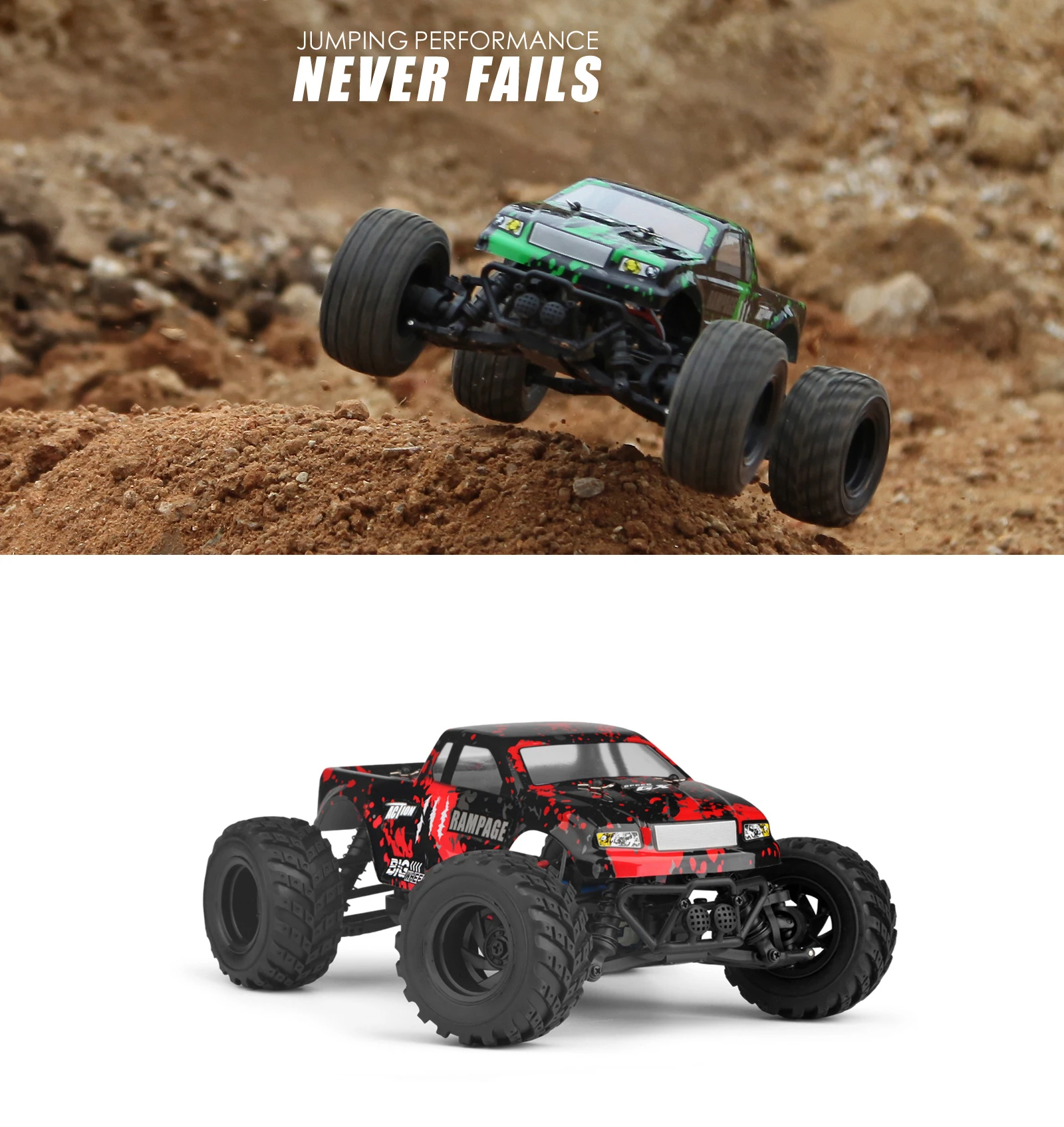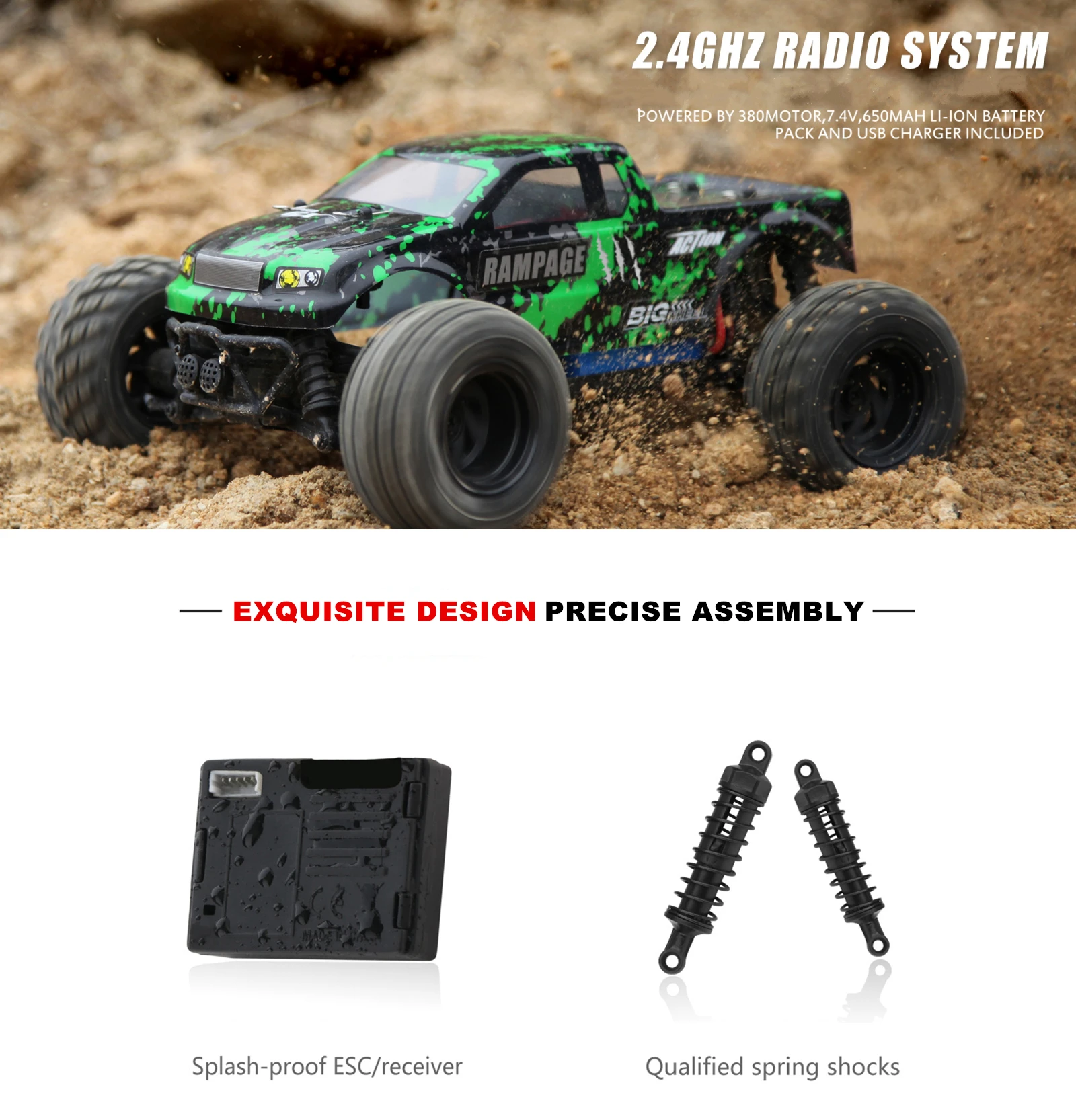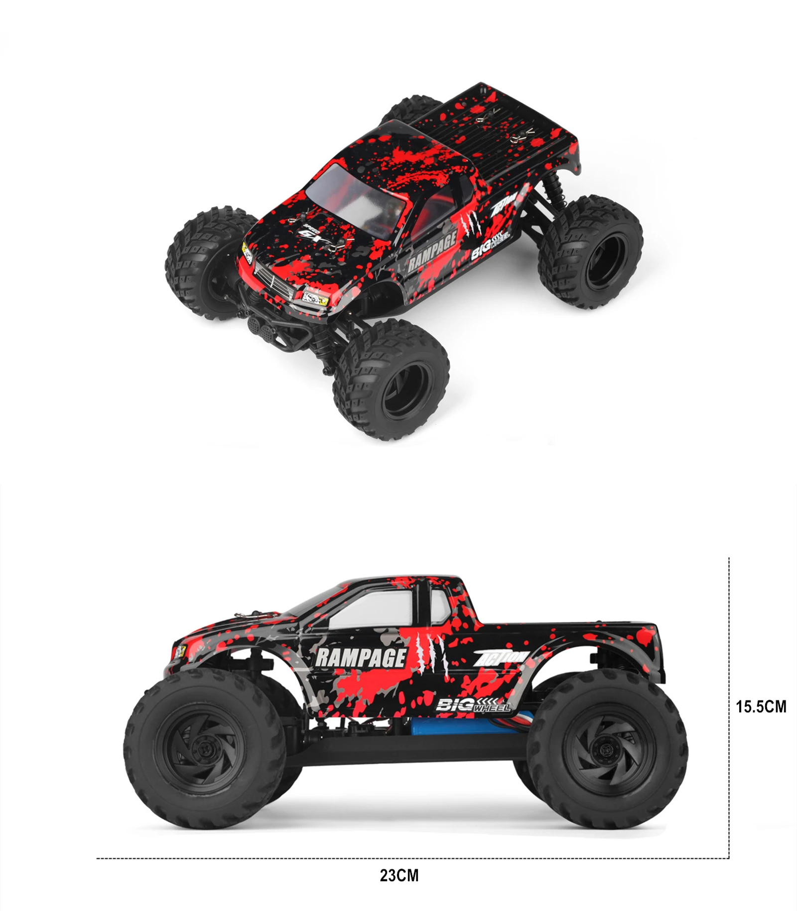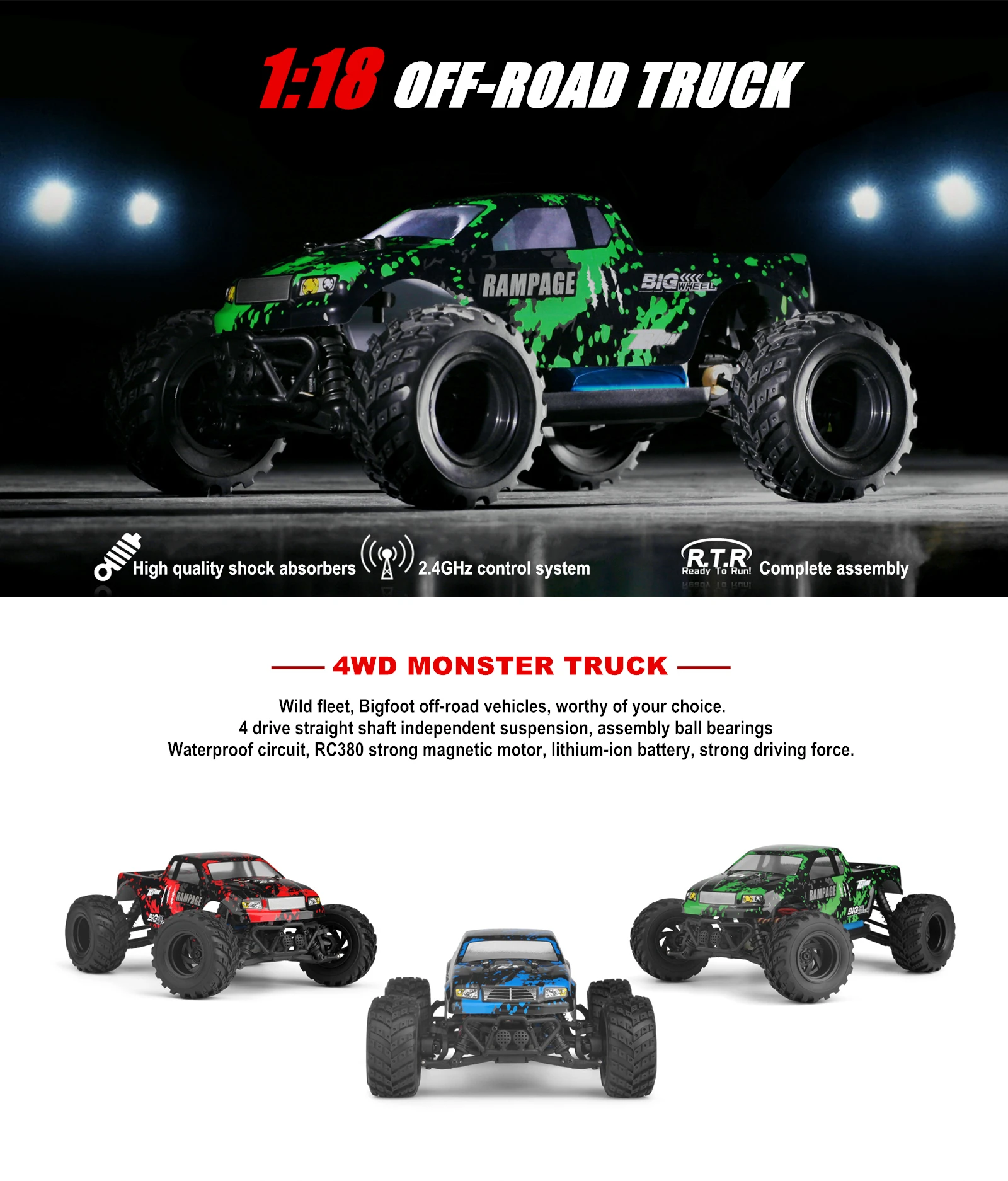Product Name: 2.4GHz OFF-ROAD TRUCK Proportion of products: 1:18 Product size: 23 x 18 x 15.5cm Wheelbase: 16cm Product color: Green / Blue / Red Drive: 380 high-speed motor Speed: 50km/h Remote control distance: 100 m Travel time: 20 minutes Charging time: 120 minutes Battery capacity: 7.4V 650MAH Materials: high-quality plastic, rubber, metal parts and electronic components Product Configuration: 4WD \ 2.4 GHz radio system \ 16G steering gear \ Front and rear differential 4 wheel independent suspension system \ 4 wheel independent shock absorber Product Function: Speed mode、Climbing、Forward、Backward、Turn left、Turn right