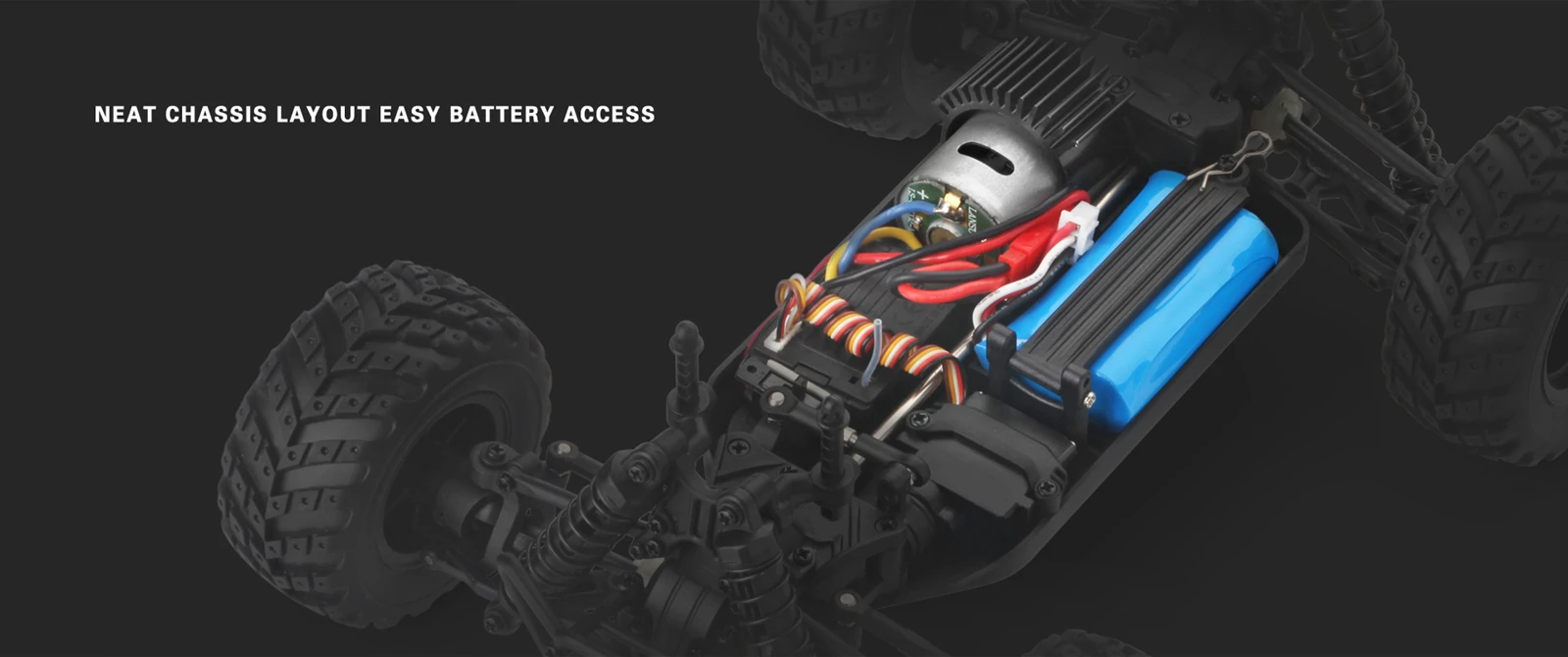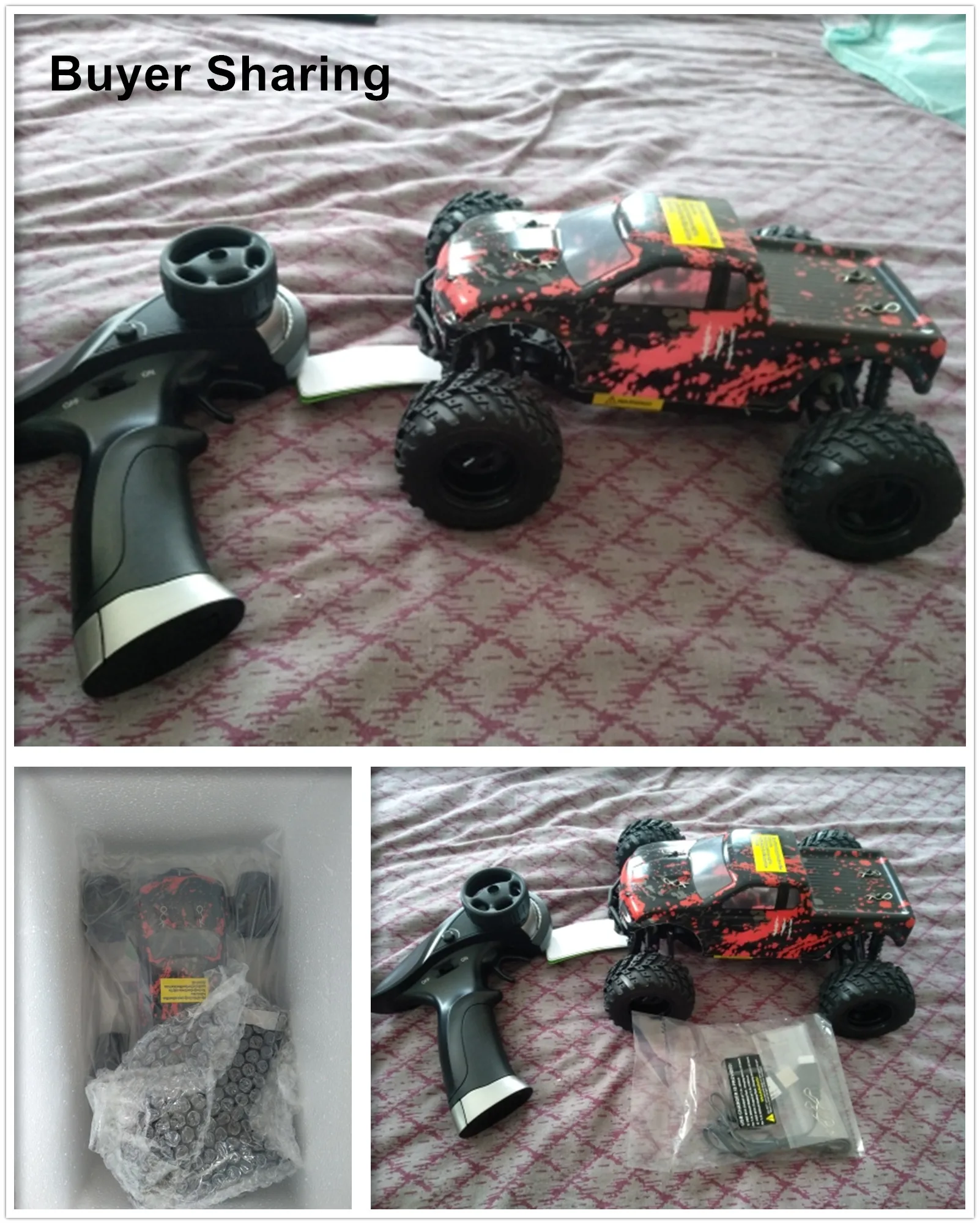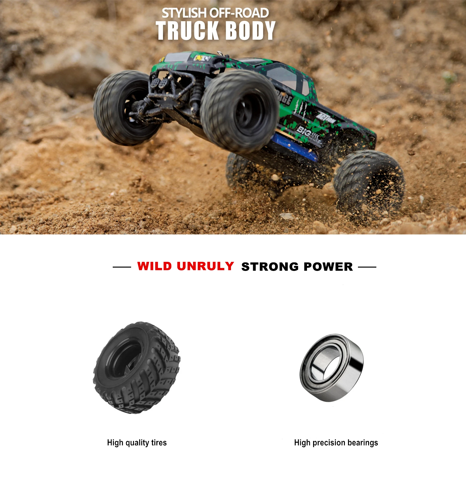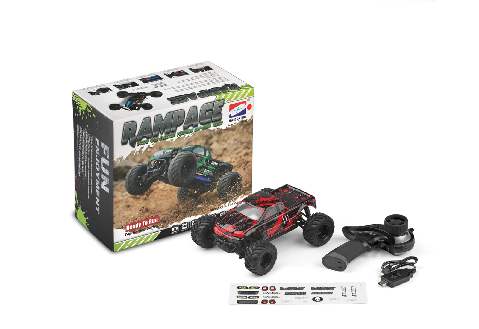 Product Name: 2.4GHz OFF-ROAD TRUCK Proportion of products: 1:18 Product size: 23 x 18 x 15.5cm Wheelbase: 16cm Product color: Green / Blue / Red Drive: 380 high-speed motor Speed: 50km/h Remote control distance: 100 m Travel time: 20 minutes Charging time: 120 minutes Battery capacity: 7.4V 650MAH Materials: high-quality plastic, rubber, metal parts and electronic components Product Configuration: 4WD \ 2.4 GHz radio system \ 16G steering gear \ Front and rear differential 4 wheel independent suspension system \ 4 wheel independent shock absorber Product Function: Speed mode、Climbing、Forward、Backward、Turn left、Turn right