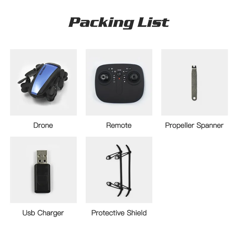 Function: Induction Touch Switch, Up/Down, Forward/Backward, Turn Left/Right, One Key Take off/Landing, Altitude Hold Mode, Speed Mode, LED Light, Headless Mode, Emergency Stop, 3D Flips, One Key Return
