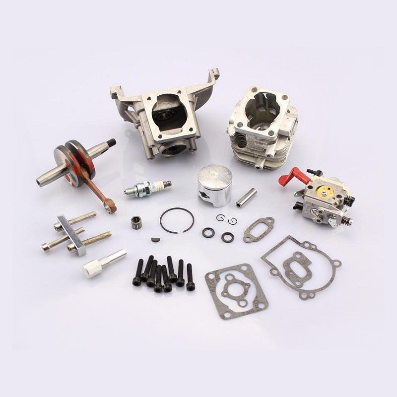 High flow enlarged intake and exhaust ports makes this a powerhouse at a great price. Runs on High octane pump gas with 25/1 two stroke oil mix. Ready to bolt right in.