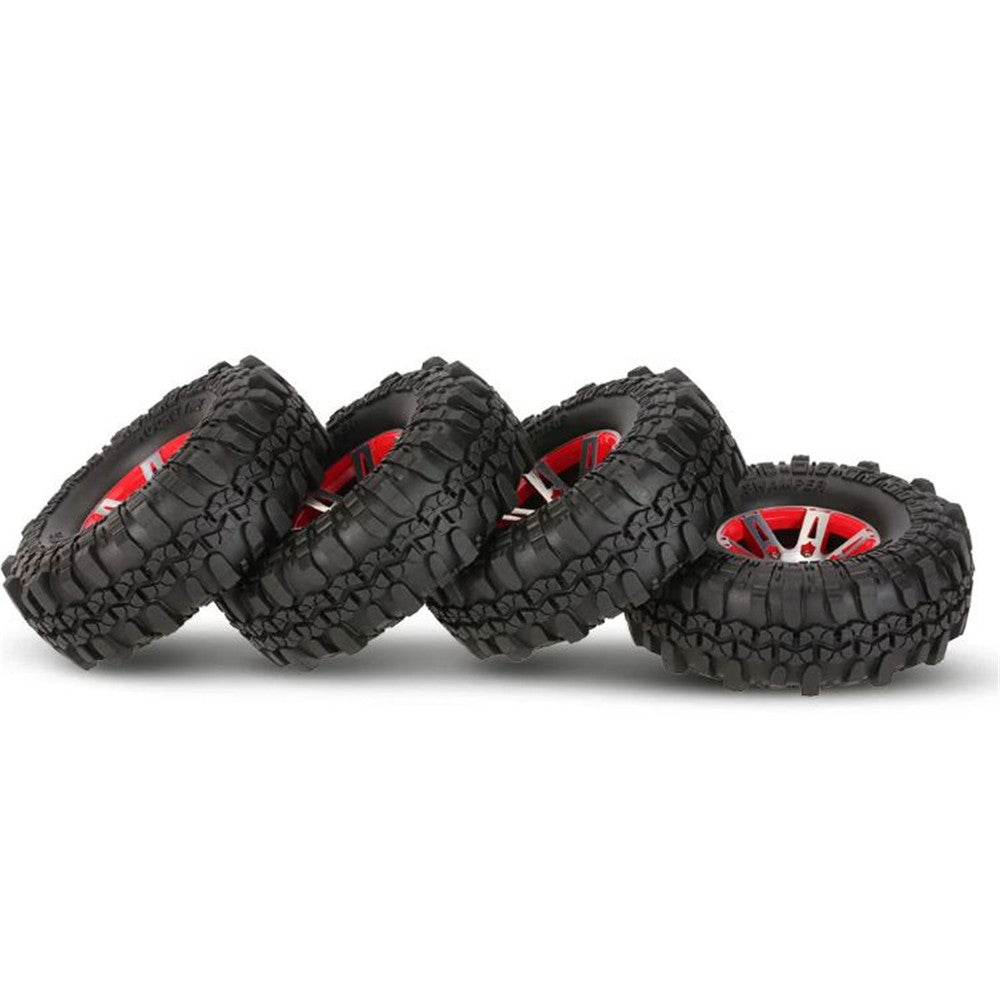 Color: Black/red wheel optional Wheel rim material: Alloy Wheel rim diameter: 52mm Wheel rim width: 27mm Hexagon adapter: 12mm Tire material: Rubber Tire outer diameter: 110mm Tire width: 42mm Suitable for: 1/10 RC D90 SCX10 AXAIL RC4WD TF2 Rock Crawler Quantity: 4Pcs Item weight: 195g/pcs