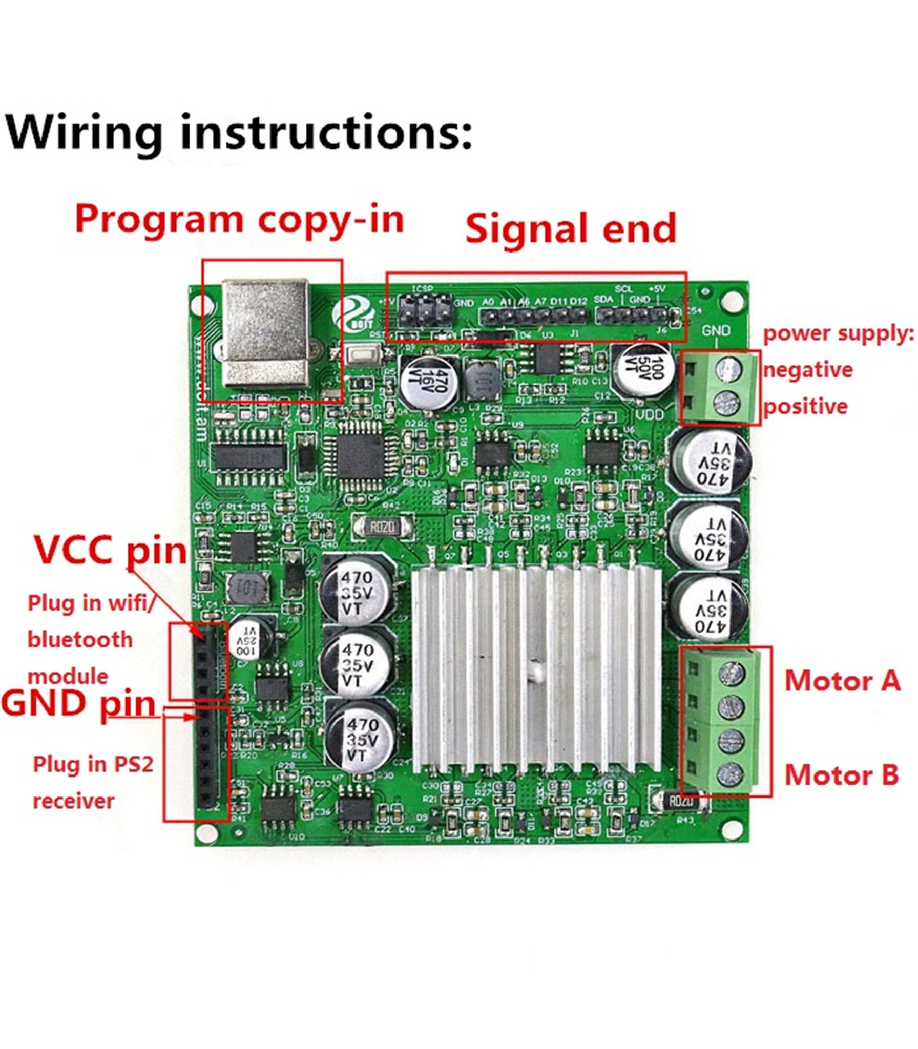 Motor output overcurrent protection software reserve detection, software can set protection threshold (connected to ATMEGA328 external interrupt port D2, please refer to schematic design parameters for specific calculation, protection current can be modified by software ≤ 20A);