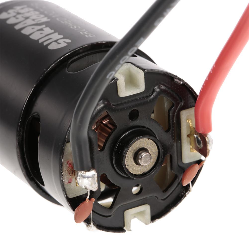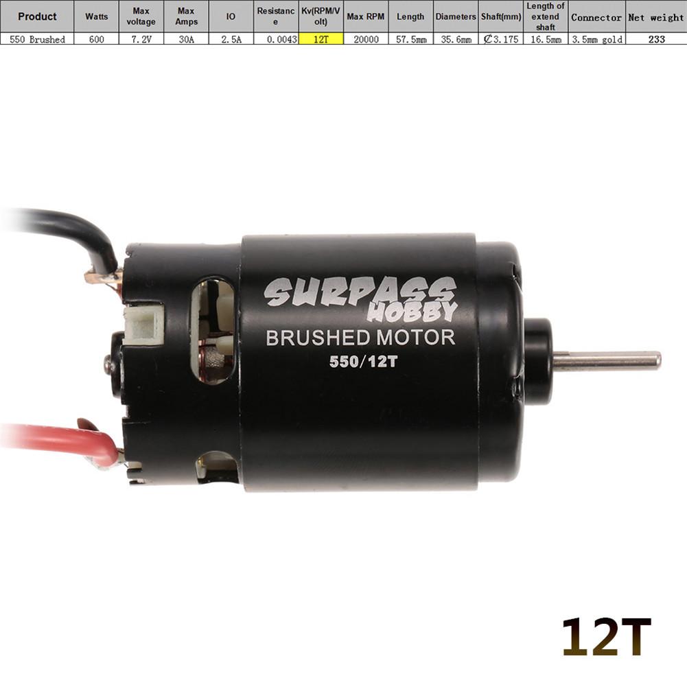 Specifications: Item brand: SURPASS HOBBY Item name: Brushed Motor Size: 550 Color: Black Max voltage: 7.4V Resistance: 0.0043 Watts: 600 Max RPM: 13000 Shaft diameter: 3.175mm Connector: 3.5mm gold Turns: 12T/21T/27T/35T Max current:30A/26A/22A/20A Suitable for: HSP HPI Wltoys Tamiya FS Kyosho Yokomo RC Car... Net weight:233g Package information: Package size: 9.5 * 8 * 6.2cm / 3.7 * 3.1 * 2.4in Package weight: 268g / 9.4oz White box package