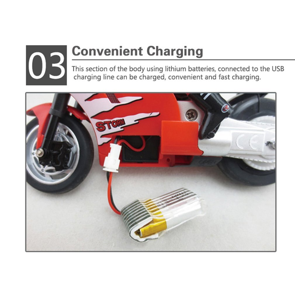 It is also ideal for your children to play it indoor or outdoor. The RC motorcycle can go forward, stop, keep balance, steer left and right.