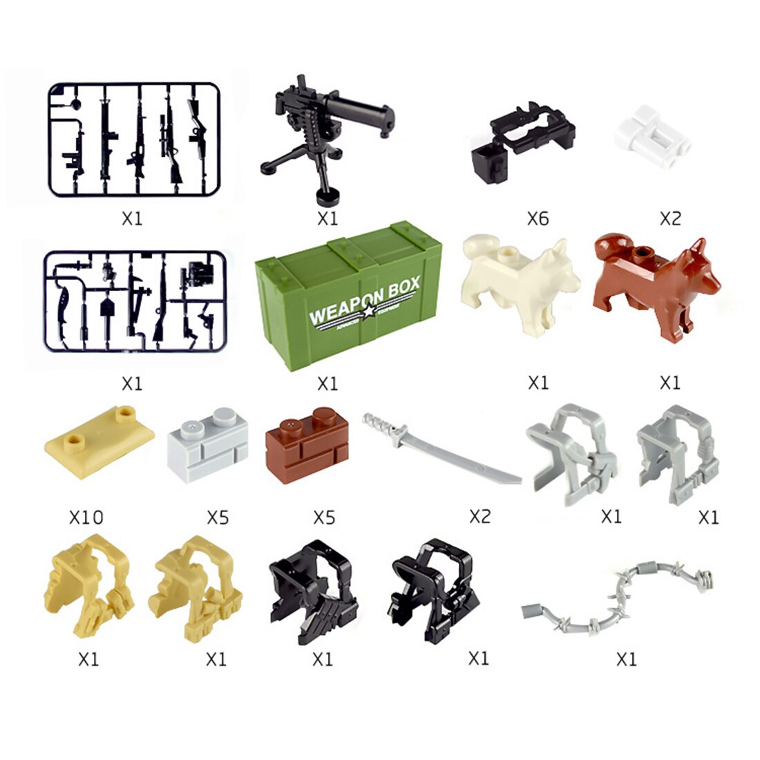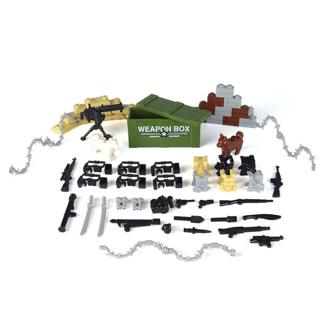 .A wide range of weapon accessories, including 2 weapon sheets, 1 water-cooled machine blaster, 6 body armor, 5 wall tiles, 10 sandbags, 2 telescopes, 2 sabers, 1 fence and 2 police dogs.