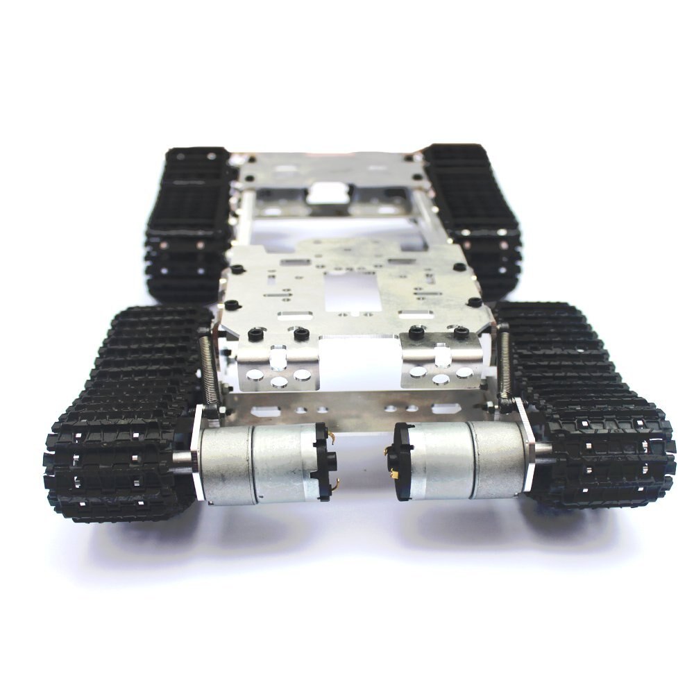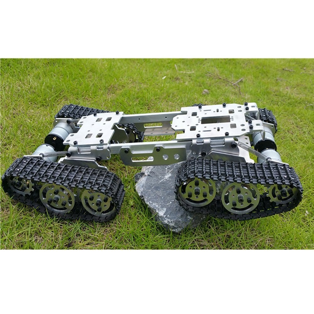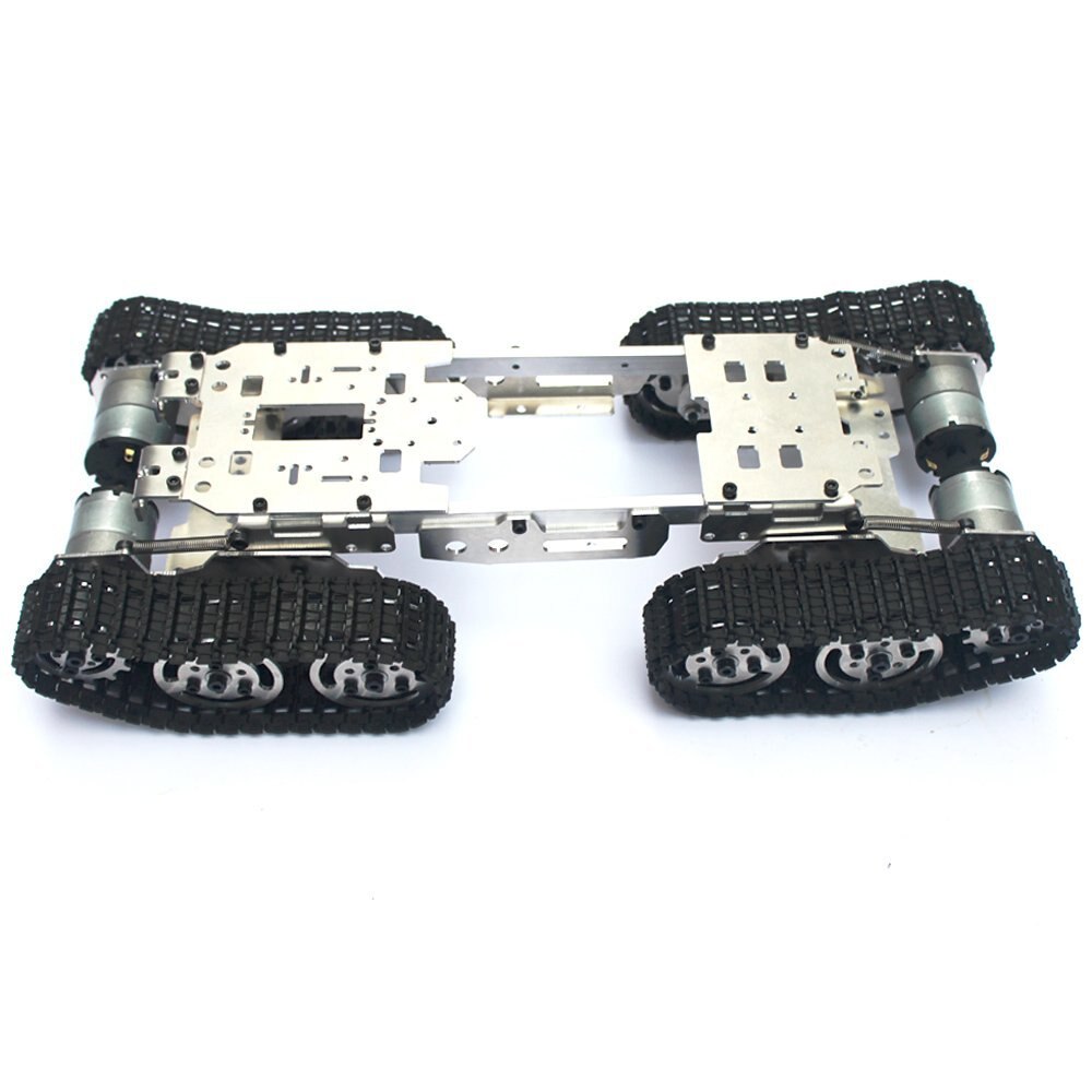 Enhanced obstacle tank chassis, the chassis body and wheel architecture uses all-metal production, refined aesthetics, solid and stable, four strong traction motor power, powerful, can retreat be Zuozhuanyouzhuan etc., and smooth operation, smooth and unhindered; It is worth mentioning that the front part of the chassis can stand freely, according to the angle of the car ramp to adjust the overall balance of the chassis, flexible operation, while the middle of the fuselage has also set aside a servo mounting port for clients installation servo convenience, the entire chassis platform leniency for customers to install the control circuit to provide enough space.
