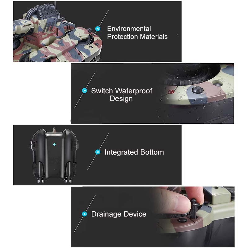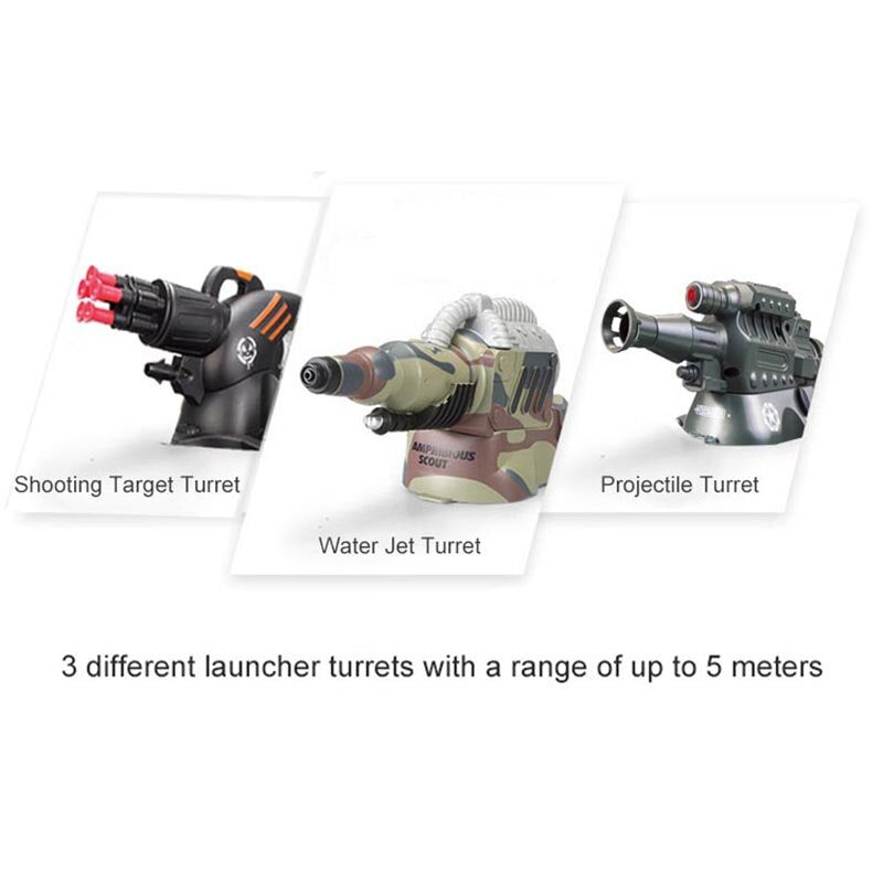 Amphibious Chariot is a water-land dual-use remote control tank. Two modes can be switched freely, it can gallop on land or cruise on water. And it has three types of turret launches: Shooting Target, Water Jet and Projectile, along with cool LED flashing lights, let you experience the fun of simulated combat.