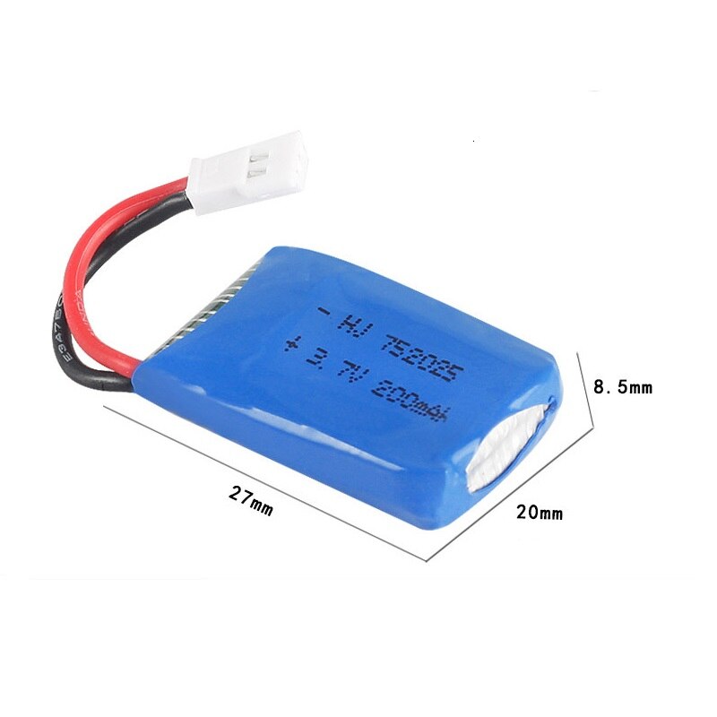 Voltage:3.7 V Current quantity :200mah Size: Length 27 * width 20* 8.5(mm) Line length:46 mm (Include plug) Weight: 7.5g Other information: 20C