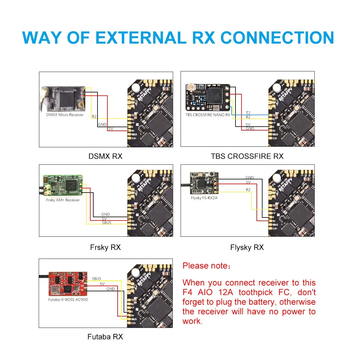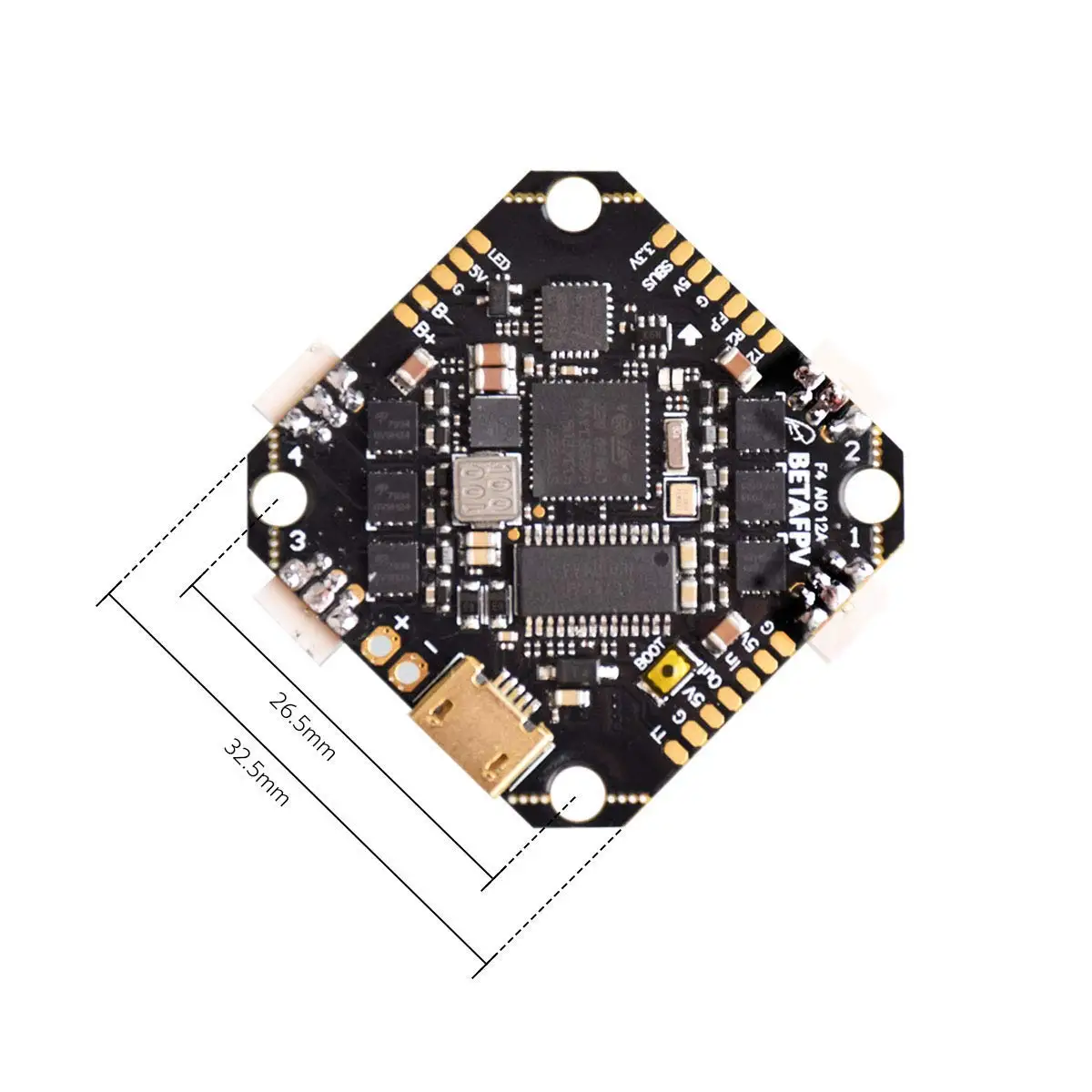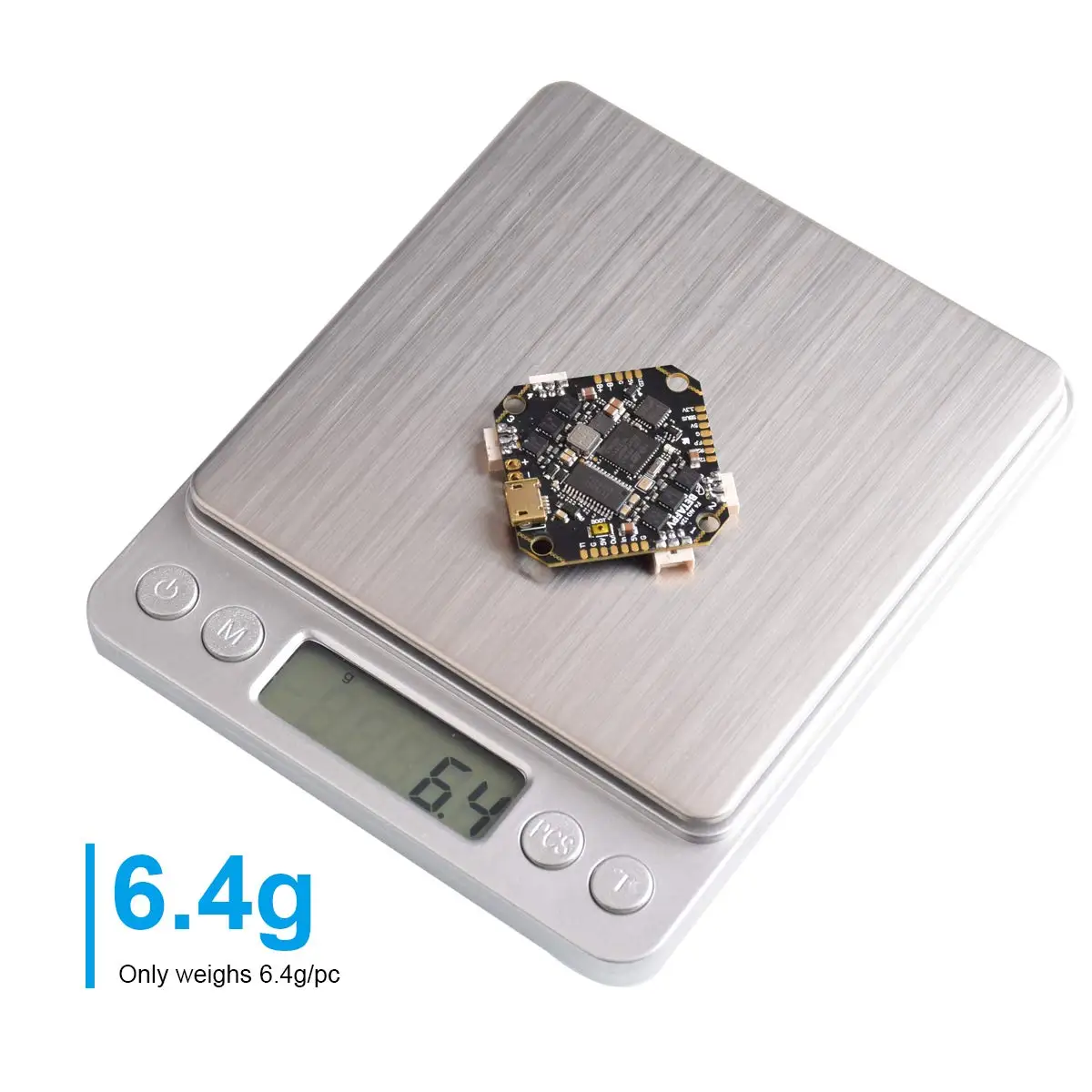 SPECIFICATIONS OF ESC Support BLheli/BLHELI_S suite Pass-through ready Support PWM, Oneshot125, Oneshot42, Multishot, Dshot150, Dshot300, Dshot600 Input voltage: 2S-4S Lipo Continue current: 12A Peak current: 15A Firmware: BLHELI_S Processor: SILABS EFM8BB21F16G-C Motor Connectors: 1.25mm header pins connector Factory firmware: G-H-30-16.7 Recommend Parts Motors: 2S: 1103 11000KV Motor 3S: 1103 8000KV Motor 1105 6000KV Motor 4S: 1105 5000KV Motor Battery: 3S: 300mAh 3S Battery 450mAh 3S 4S: 450mAh 4S Battery Frame: HX100 Frame Package: 1 * F4 2-4S AIO 12A Toothpick Brushless FC with motor pluggable pins 4 * M1.2x4mm screws 4 * M1.4x5mm screws 4 * Anti-vibration rubber dampers