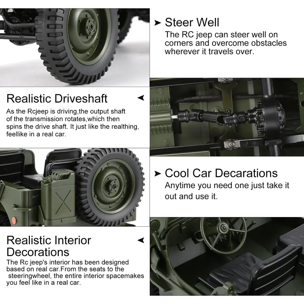 1.Realistic Interior Decorations:The Rc jeep's interior has been designed based on real car.From the seats to the steeringwheel, the entire interior spacemakes you feel like in a real car.