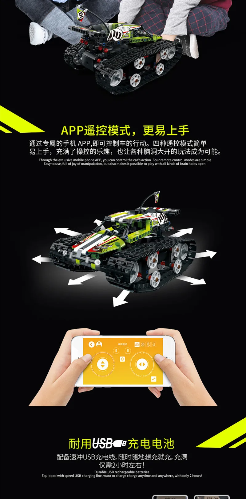 Product Name: Technic APP RC Car Building Blocks Number of Blocks: 410Pcs Package : no original box,new in sealed bag(Toys and instructions send together). Pacakge Inside : 1 x Remote Controller 1 x USB Charger 1 x Instruction Manual and building blocks Notice : 1. The Remote Controller should be used No. 7 battery (AAA battery)by the customer . 2. The Motor Battery Box should be charging by the USB charger. 3. Do not eat , keep aways from fire.