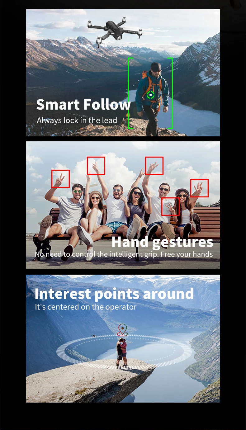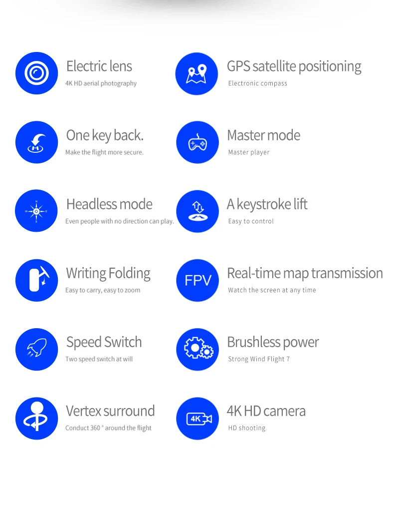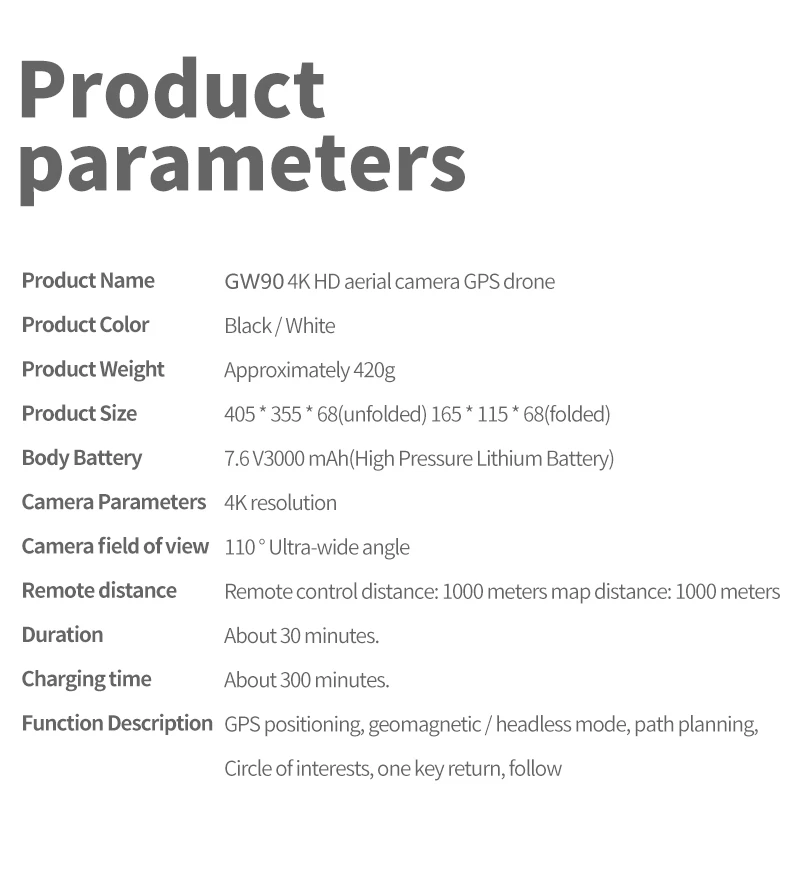Features: 1.The remote control can adjust the camera angle up and down, and the upper and lower can be adjusted continuously by 90 degrees. 2.WIFI 120 degree wide-angle HD, pixel 4K, camera pixel is 3840*2160P, real-time transmission is 30 frames / sec, WiFi map transmission distance is 200-400 meters. 3.WiFi camera can use the mobile phone / remote control to take pictures. 4.The product adopts foldable design for more convenient storage. 5.The product has both outdoor GPS positioning and indoor optical flow positioning to ensure stable hovering indoors and outdoors. 6.The battery adopts modular design, which is convenient for users to purchase more electricity and fly for a long time. Descriptions: 1.Indoor air pressure fixed / optical flow positioning / outdoor dual-mode GPS fixed point / GPS one-button return. 2.The return setting includes: one-button return/low-pressure return/uncontrolled return. 3.Mobile APP implements automatic follow/surround/pointing flight. Specifications: Brand Name: Global Drone Product Name: Brushless GPS Drone Model Number: GW90 Material: ABS&Hardware&Electronics Color: Black Unfolding Size: 355x400x68mm/13.98x15.75x2.68in Folding Size: 160x105x68mm/6.30x4.13x2.68in Body Weight: 420g/14.82oz Flight Distance: 1000 Meters Remote Frequency: 2.4GHz Motor: 1806 1600KV Paddle: 3 Inch Folding Front and Back Paddle Flight Time: 25-28 Minutes GPS: Dual Mode (GPS/ Glonass) Headless Mode: Remote Control Button Switching Camera: 5G Long Distance 500 Meters WiFi Cloud Platform: Camera Up and Down Angle: Adjustable 90 Degrees Remote Controller: Two-way Return/LCD Display Attitude Data Battery: 2S 25C 7.6V 3000mAh Charging Method: USB Charging. Battery Built-in Balance Charger Charging Time: 300 Minutes Geomagnetic: Built-in Module Fence: Default: Height 100 Meters / Distance 250 Meters Photo Pixel: Photo: 4096*3072 (4k) Image Pass Pixel: 1080p/30fps Video Size: 1920*1080 Applicable Age: 14+ Package Informations: Package Size: 275x205x10mm/10.83x8.07x0.39in Package Weight: 1358g/2.99lb Storage Box Package Package Included: 1 x GW90 Brushless GPS Drone 1 x Battery 1 x Remote Control 2 x Spare Fan Blade 1 x USB Cable 1 x Screwdriver 1 x Manual 1 x Blade Wrench 1 x Storage Bag (Optional) Notes: 1.Due to the light and screen difference, the item's color may be slightly different from the pictures. 2.Please allow 0.5-2 cm differences due to manual measurement.