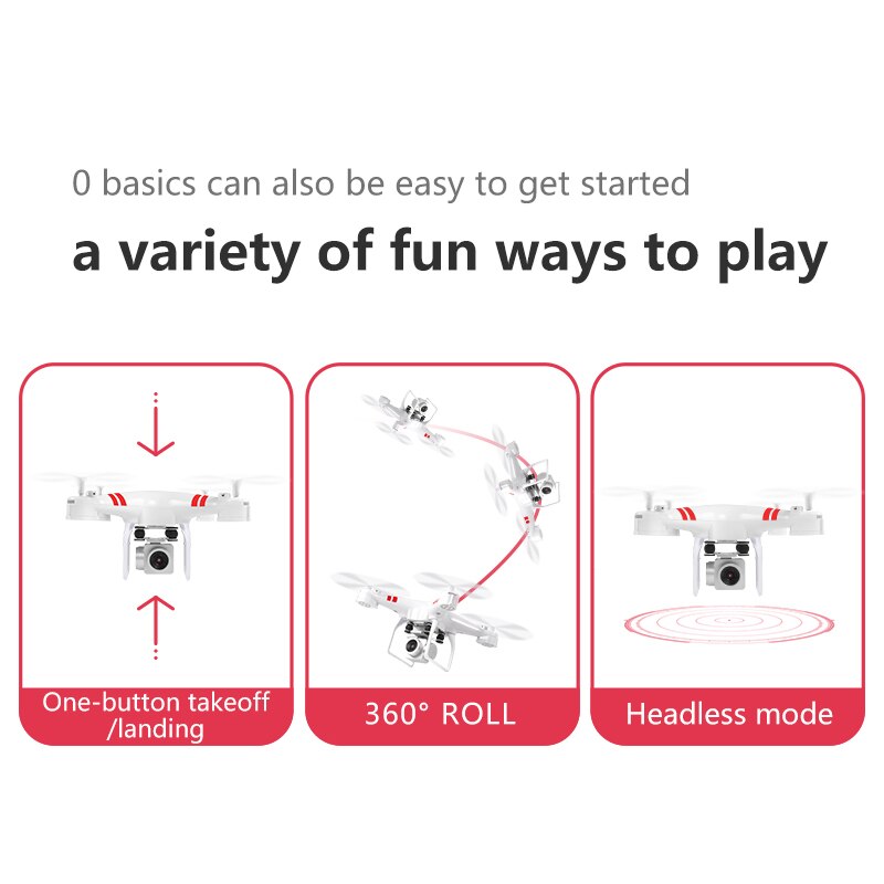 Product Name: KY101D (fixed high WIFI version) Product specifications (cm): 28*28*10cm Main material: ABS Product color: black, red, white Individual product weight (including color box): 560G Body take-off weight: 95G Color box specifications (length * width * height): 40.8 * 22.8 * 10.8cm Battery parameters: 3.7V-1800mA/H lithium ion rechargeable battery (distribution) Remote control battery parameters: AAA*3-6V alkaline battery (self-provided) Charging method: USB cable charging Charging time: about 80 minutes Flight time: about 18 minutes Remote control distance: 100m Flying height: 100m Product Features: 1: four-channel, six-axis gyroscope; 2: Wide-angle WIFI real-time transmission (photo/video/gravity sensing/video plus music, etc.); 3: Air pressure is set high / hovering; 4: One button takeoff / one button down / one button emergency stop; 5: High, medium and low speed design; 6: rising and falling / forward and backward / left and right turn / left and right side fly / fine adjustment; 7: 360O 3D flipping in front, back, left and right directions; 8: Headless mode, one-button return; 9: battery protection function; 10: Height rotation, hovering; 11: Light control switch The order contains: Quadcopter*1 Remote control*1 Instruction manual*1 USB charging cable*1 Protective cover*4 Landing gear *2 Spare blade *2 Battery*1 Mobile phone holder*1 (with camera version) Camera*1 (optional)