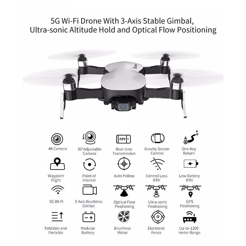 Function:Up/down, Forward/backward, Turn left/right, Sideward flight, Headless Mode, GPS Positioning, Follow Me, Orbit Mode, Waypoint Flight, Optical Flow, Ultrasonic Altitude Hold Mode, WiFi FPV, Camera/Video, Gravity sensing, Pairing&Sharing  function