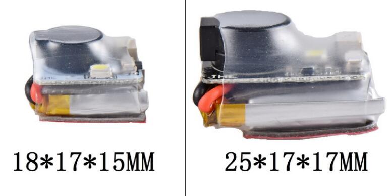 The buzzer has two modes of operation:    1. It is compatible with the functions of the traditional active buzzer and synchronized with the flight control.    2. When the flight control is normally connected, if the main battery in the flight is powered off, it can still automatically emit 100 dB of drip sound after 30 seconds of power failure, and the LED will emit white light, and the sound is louder than the general buzzer. Much bigger. How to turn off the buzzer:      Press and hold the release button for more than 2 seconds, the JHE42B_S Finder turns off the sound.    The JHE42B_S Finder is compatible with all BF and CF flight controls. Just connect to the buzzer interface of the flight controller and it will work. When the flight control wiring is correct, the multi-rotor aircraft is powered on, and the flight control power supply will automatically charge the JHE42B_S Finder (the red LED will light to indicate that charging is in progress, Red LED off means charging is saturated; red light flashing means flight controller is powered off, wait 30 seconds waiting time). Size:    18*17*15MMWeight:  4.3 g Packing list:   JHE42B_S Finder 1 PCS
