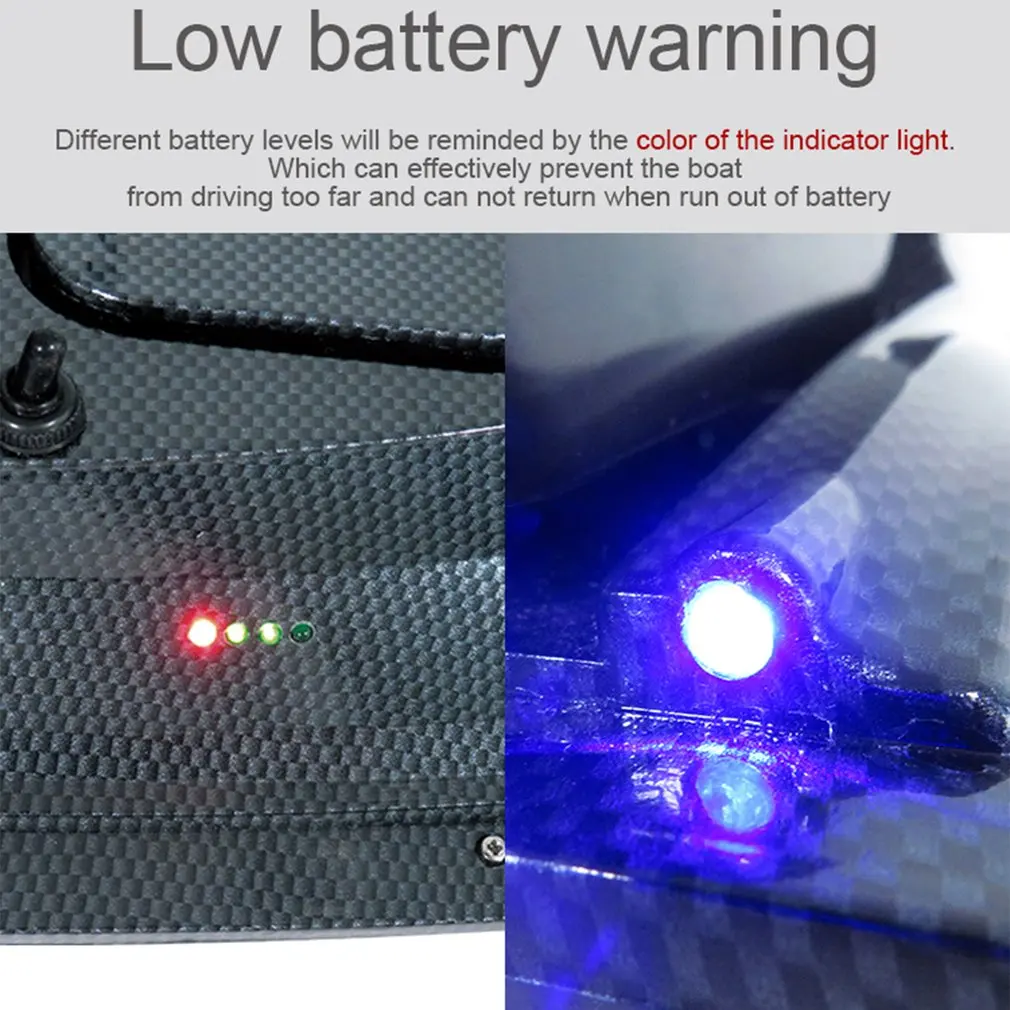 9.Low battery reminder,Different battery levels will be reminded by the color of the indicator light. The low battery reminder can effectively prevent the ship from driving too far, and there is no power to return.