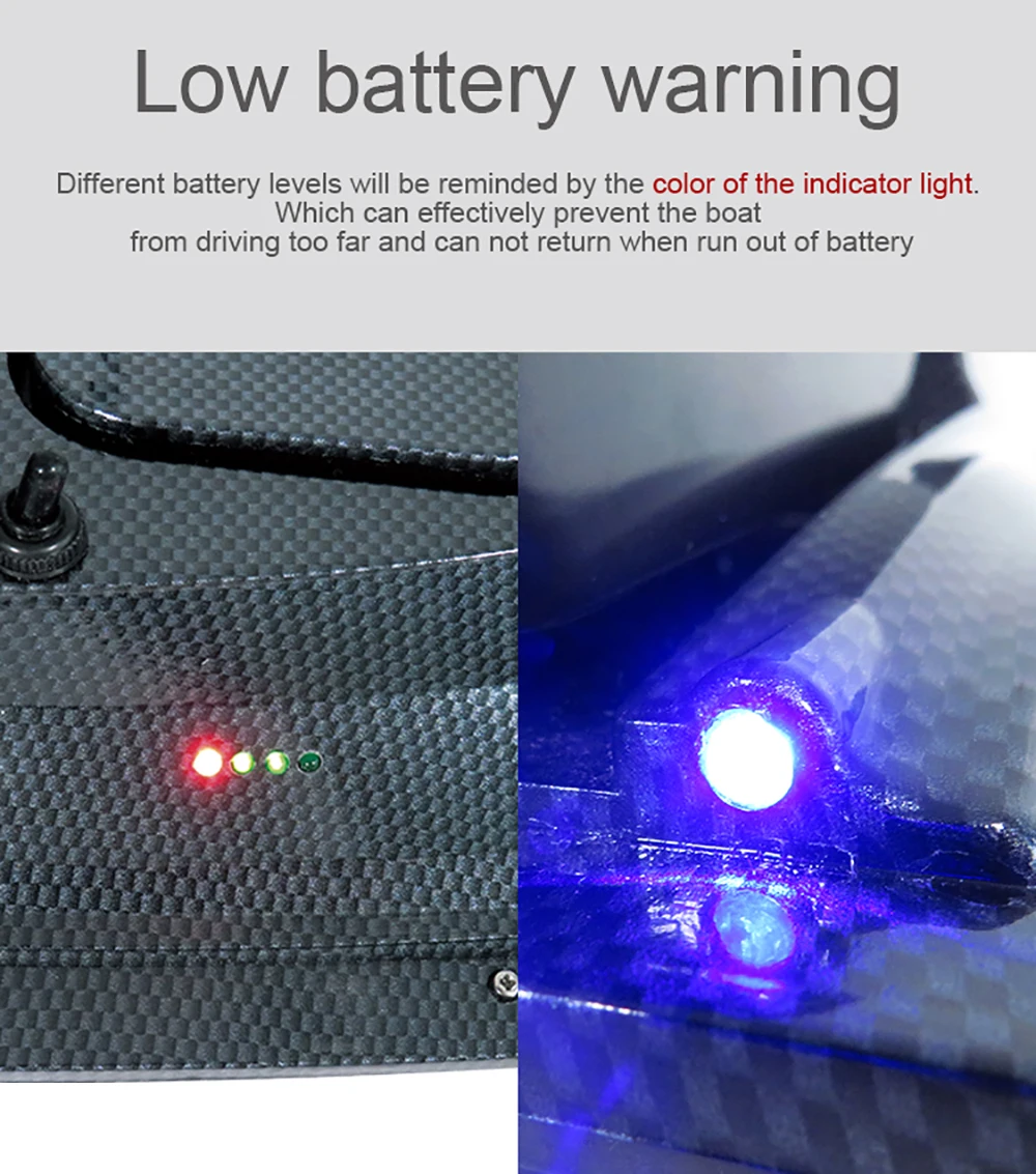 Different battery levels will be reminded by the color of the indicator light. The low battery reminder can effectively prevent the ship from driving too far, and there is no power to return.