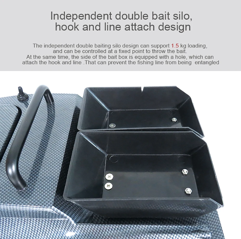 The utility model adopts independent double silo design with a load of about 1.5kg and can control the fixed point nest at will, and the side of the material box is provided with a card slot hole, which can be sent to the hook to prevent the fishing line from being entangled.