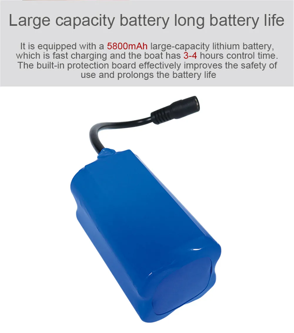 It is equipped with a 5800mAh large-capacity lithium battery, which is fast charging and the boat has 3-4 hours control time. The built-in protection board effectively improves the safety of use and prolongs the battery life;