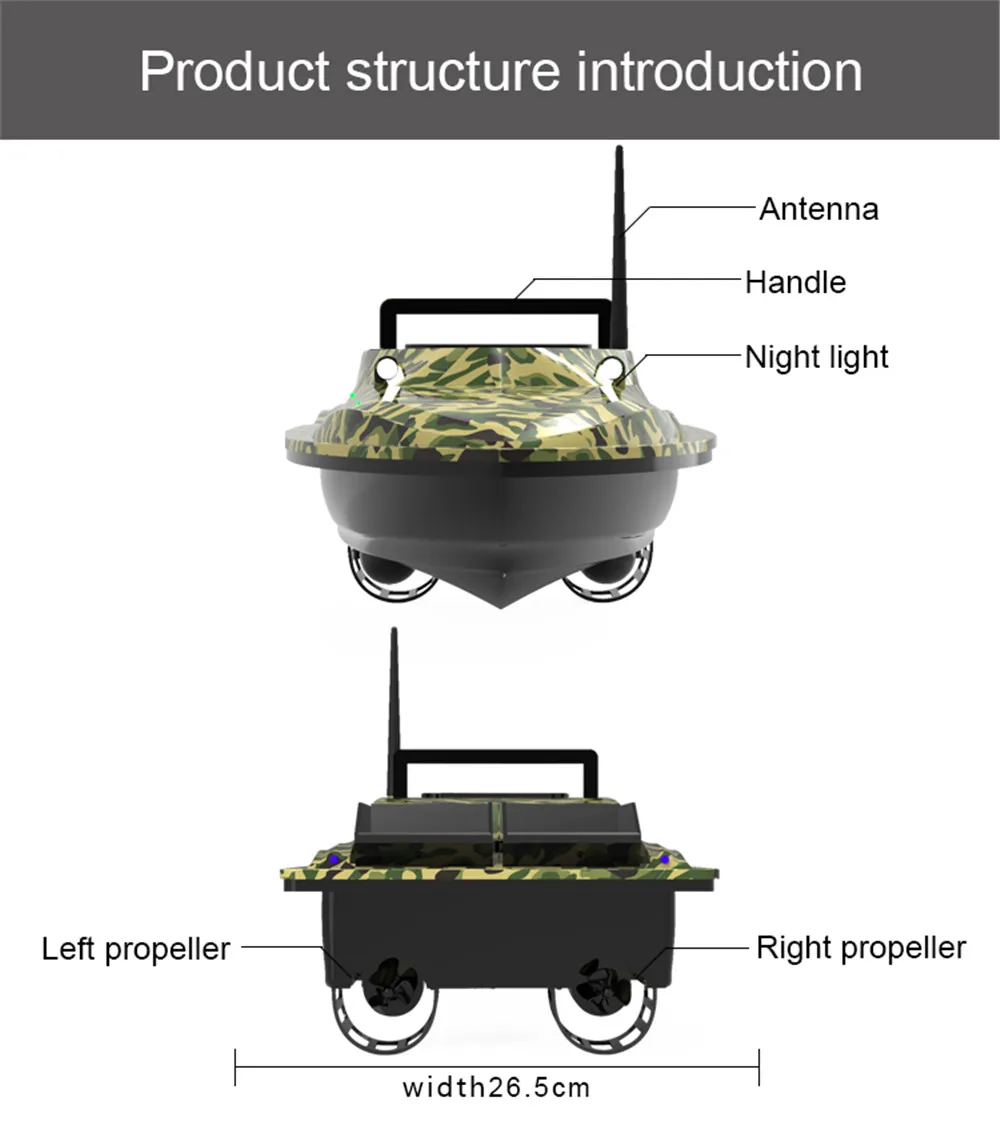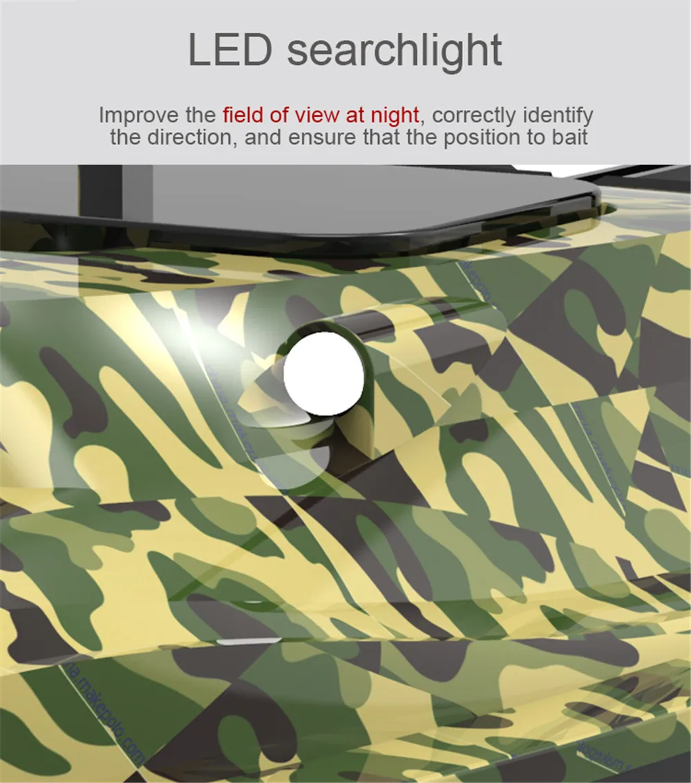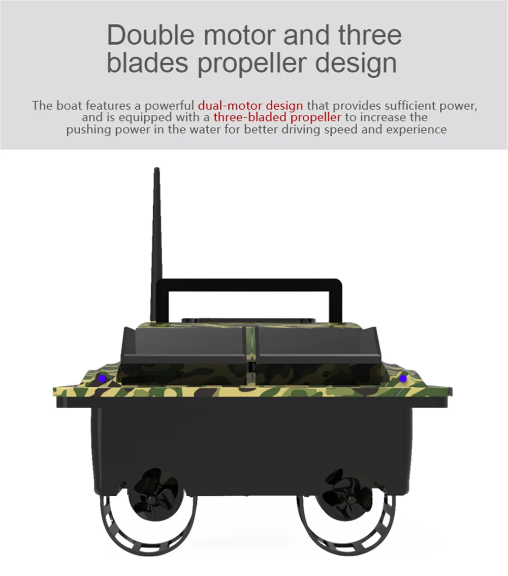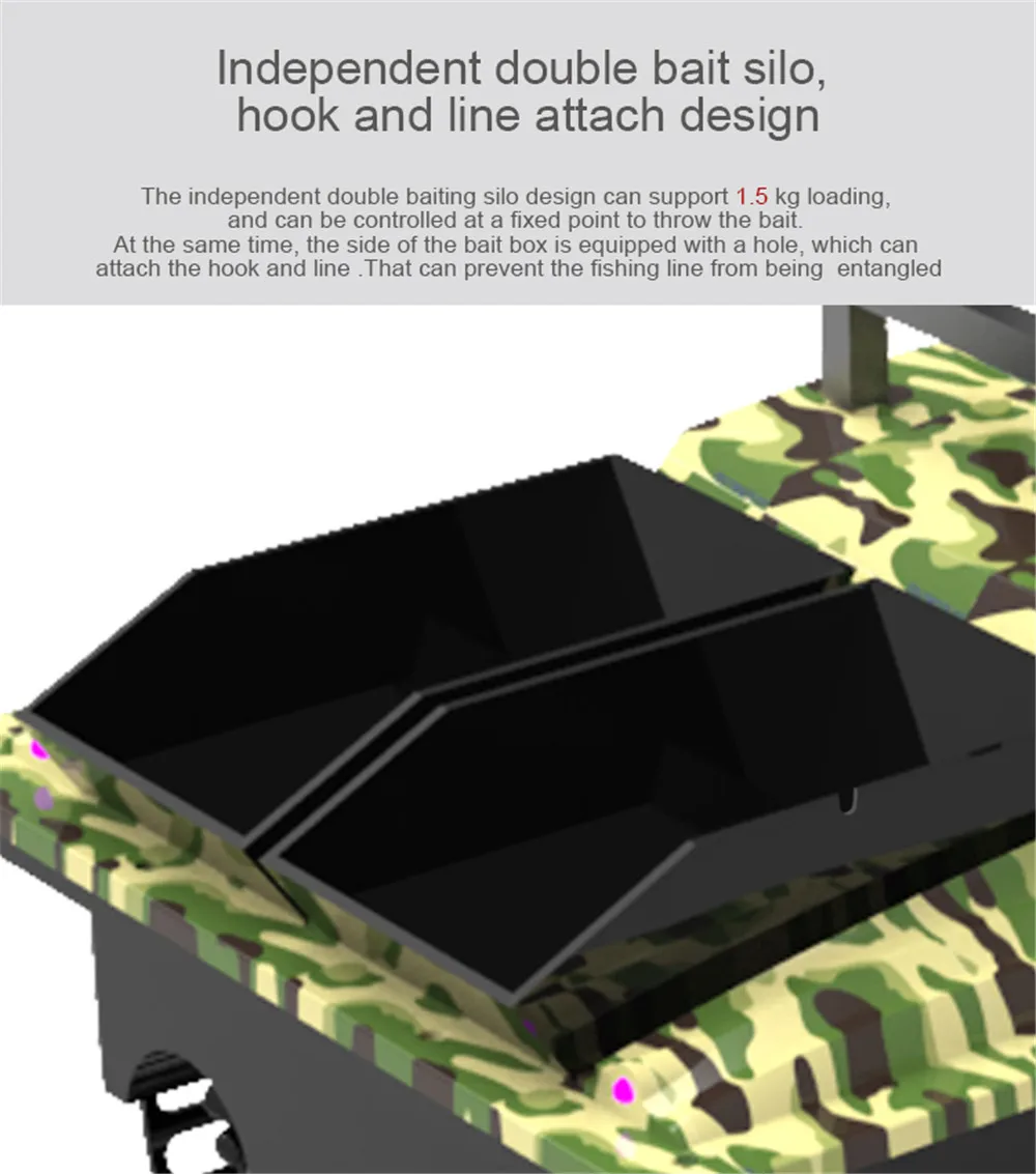 The independent double baiting silo design can support 1.5 kg loading, and can be controlled at a fixed point to throw the bait. At the same time, the side of the bait box is equipped with a hole, which can attach the hook and line .That can prevent the fishing line from being entangled.