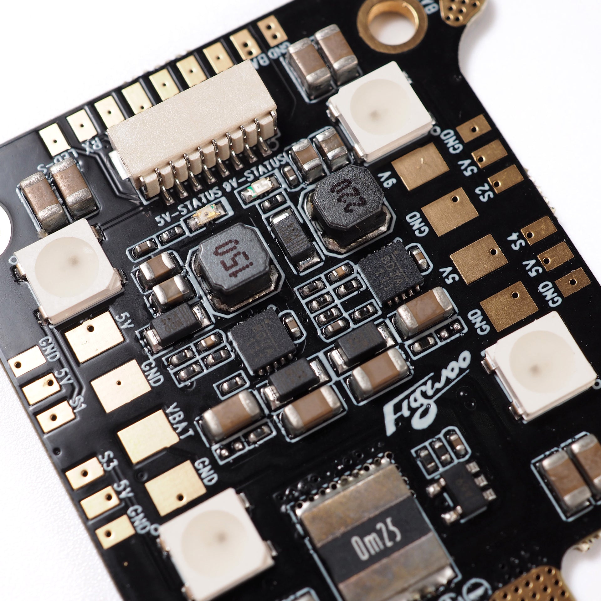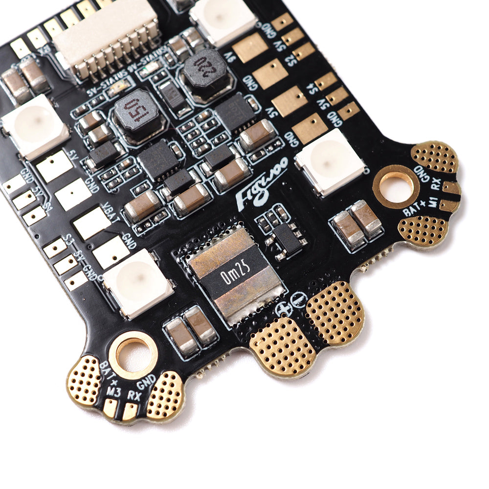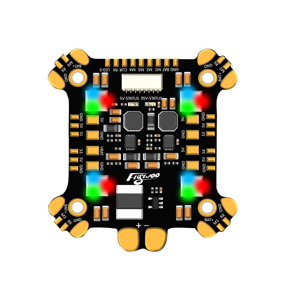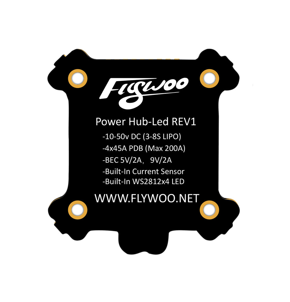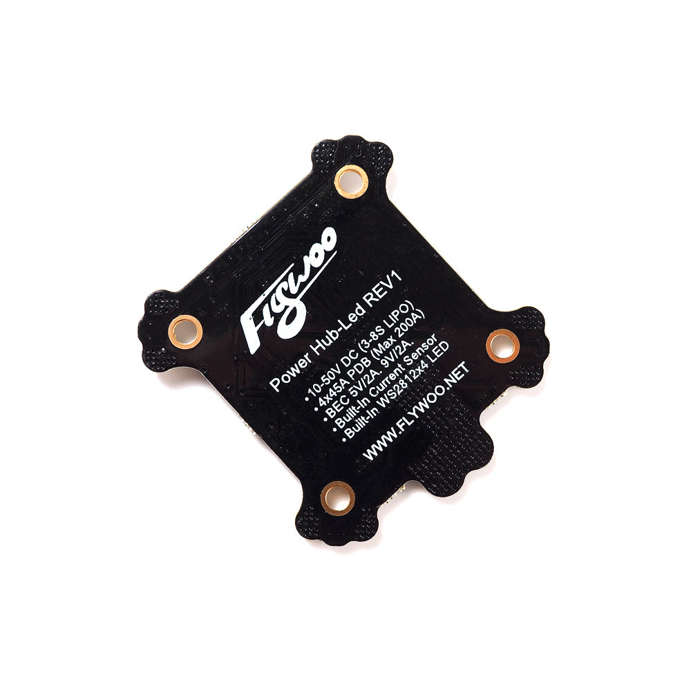 FLYWOO Power Hub-LED Rev1 Board with built-in 4 sets of WS2812 lamp beads has unique design, user-friendly layout and stable high-performance dual DCDC module while supporting high voltage and high current. These make the board shine colorfully.