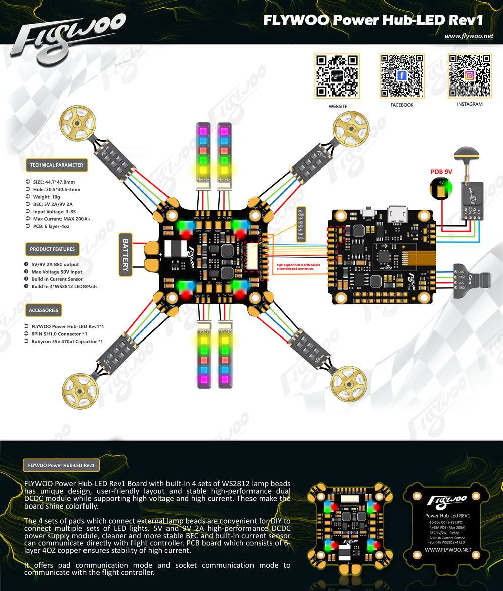FLYWOO Power Hub-LED REV1 PDB Built In 5V 9V 2A BEC WS2812 LED 3-8S For RC Drone FPV Racing Multi Rotor