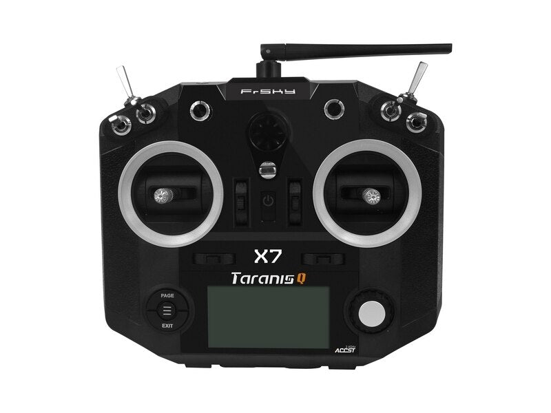 This is the latest powerful radio system from FrSky, the Taranis Q X7. This is a lightweight feature packed reliable system and it comes in black or white color scheme. The radio includes a Haptic Vibration Feedback System which provides an alternative feedback system to the voice and sound alert warnings. This 16 channel radio has smooth ball bearing gimbals and is loaded with six switches and two knobs. It runs on OpenTX and files can be shared with the popular X9D Plus. The MicroSD card slot offers unlimited model memory options , it also has a USB port for upgrades and to connect to a PC for adjusting settings. Both sticks come with spring loaded return to center sticks, this makes changing from mode 1 to mode 2 extremely easy to set through the menu and the stick can quickly be set to a stationary throttle by unscrewing four screws and removing a spring.