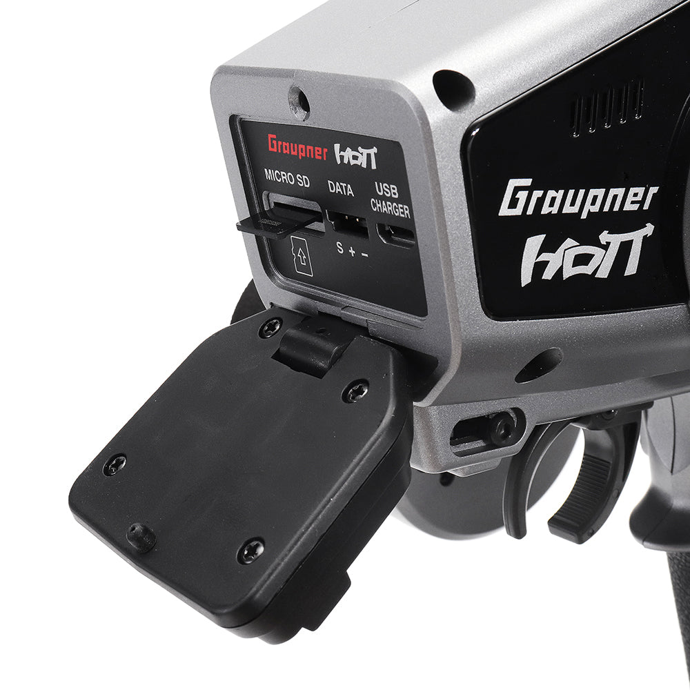 The Colt transmitter comes with an extra-powerful 5000 mAh LiPo battery that can be easily charged via the included micro-USB charger. The package also includes the excellent GR-8 Race receiver (No. 33504), a 4 GB micro SD card and all cables.