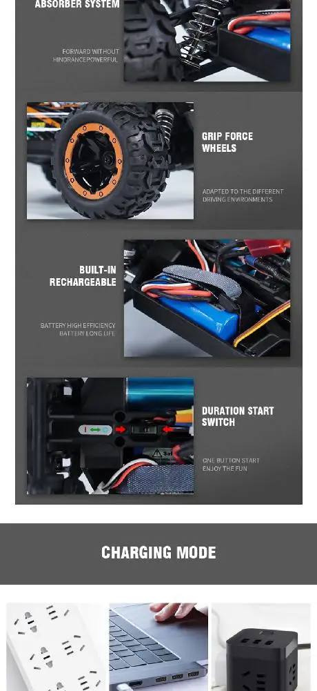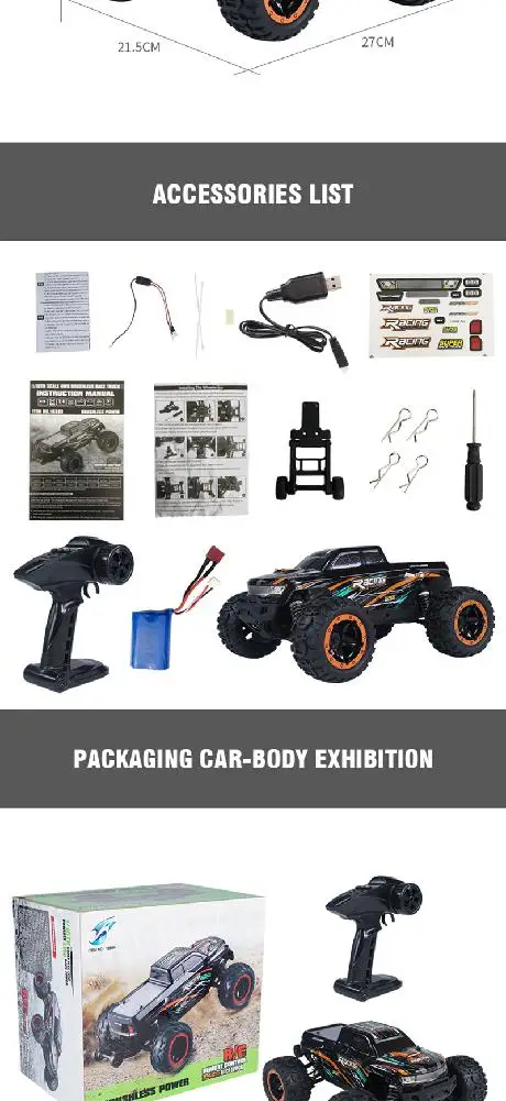 Packing List: 1 X RC Car(included the battery) 1 X Transmitter 1 X USB Charging Cable 1 X Manual