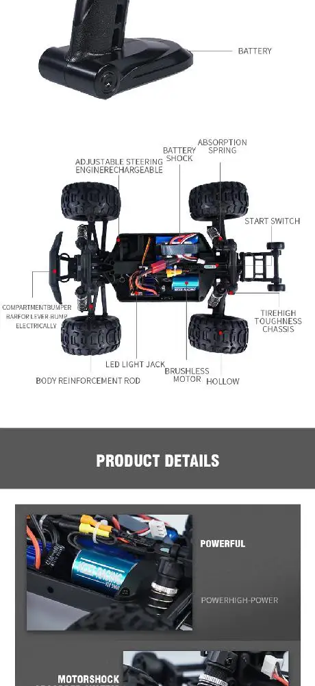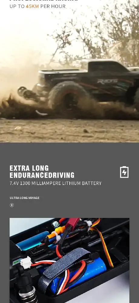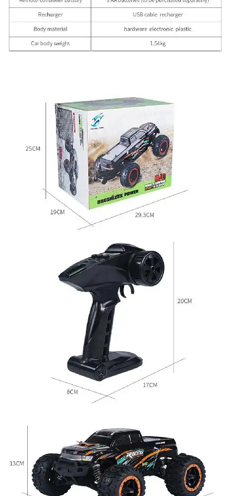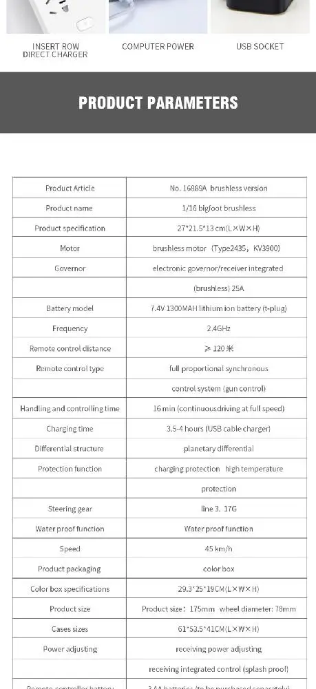 Specification: Brand: HBX Item No: 16889A Frequency: 2.4G Scale: 1/16 Max Speed: 45km/h Servo: 17G 3 wires steering servo Color: As the picture shown Car Size: 270*215*130mm Material: Hardware and plastic Battery for the car: 7.4V 1300mAh Li-ion battery(Included) Wheelbase: 175mm ESC: 7.4V 25A (intergrated ESC/Receiver) Using Time: 16-20 minutes Motor: 2435 3900kv brushless engine Wheel Diameter: 78mm Charging Time: About 3.5-4 hours Wheel Width: 41mm Remote Distance: >100m Transmitter Battery: 3X 1.5V AA(not included) Gear Ratio: 1