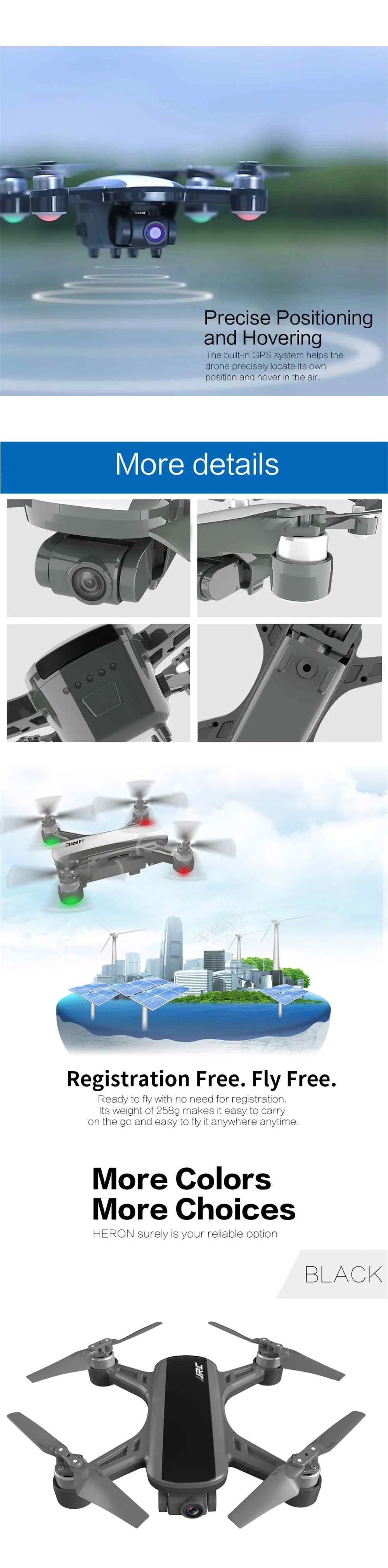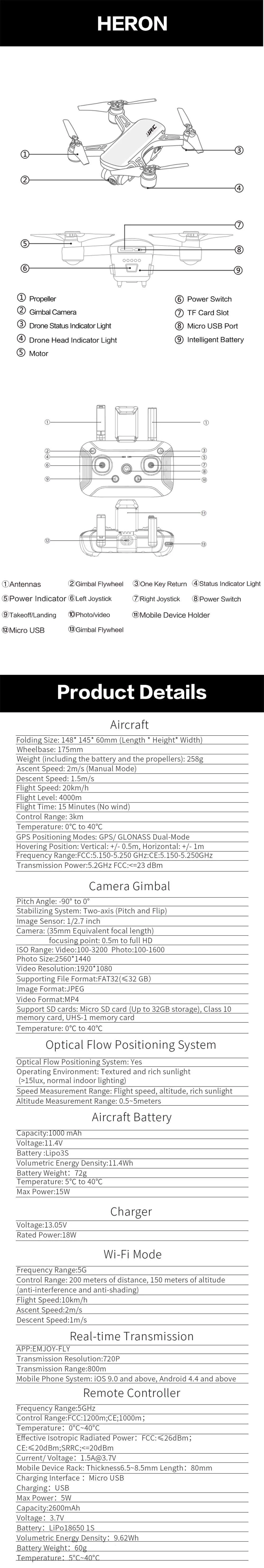 Brand Name: JJRC Item NO.: X9P Item Name: Heron Drone Wheelbase: 175mm Battery: 11.4V 1000mAh 3S Lipo Volumetric Energy Density: 11.4Wh Charging Time: About 90 Mins(Power adapter using DC 5V 2A) Max Power: 15W Battery Weight: 72g Battery Temperature: 0°C~40°C Flight time: 15 mins Control Range: 3000m Flight Speed: 20km/h Flight Level: 4500m Ascent Speed: 2m/s Descent Speed: 1.5m/s Temperature: 0°C~40°C Charger Voltage: 13.05V Charger Rated Power: 18W GPS Positoning: GPS/ GLONASS Dual-Mode Quadcopter Size: 148 x 145 x 60mm Quadcopter Weight: 258g Battery Size: 80 x 47 x 35.5mm Battery Weight: About 80g Color: Black, White (Optional) Hovering Position: Vertical: +/-0.5m, Horizontal: +/-1m Frequency Range: FCC: 5.150-5.250GHz CE: 5.150-5.250GHz Transmission Power: 5.2GHz FCC: ≤23dBm |