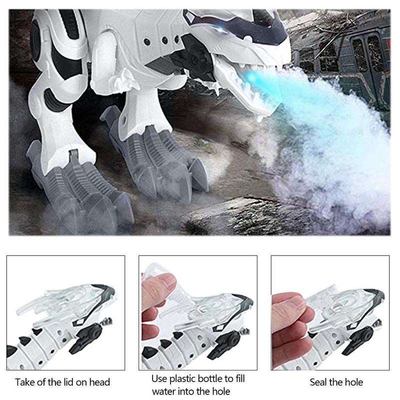 1.Fantastic Design with Mist Spray Function: The dinosaur can spray mist with red light every several seconds, just like fire erupted from mouth. There is a built-in water case in head, and you just need to use provided plastic bottle to fill water into the hole. Please note that the water each filling can only support several times mist spray caused by water volume limit.