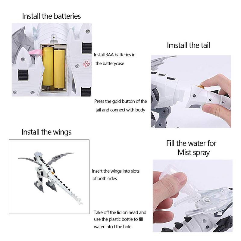 4.Easy to Install and Play: Only need to put 3 AA batteries in the battery case and install the wings and tail by hand, fill the water in head, then turn on the power button. Attention: For boys and girls ages 3+. 3 AA Batteries are not included in the package.
