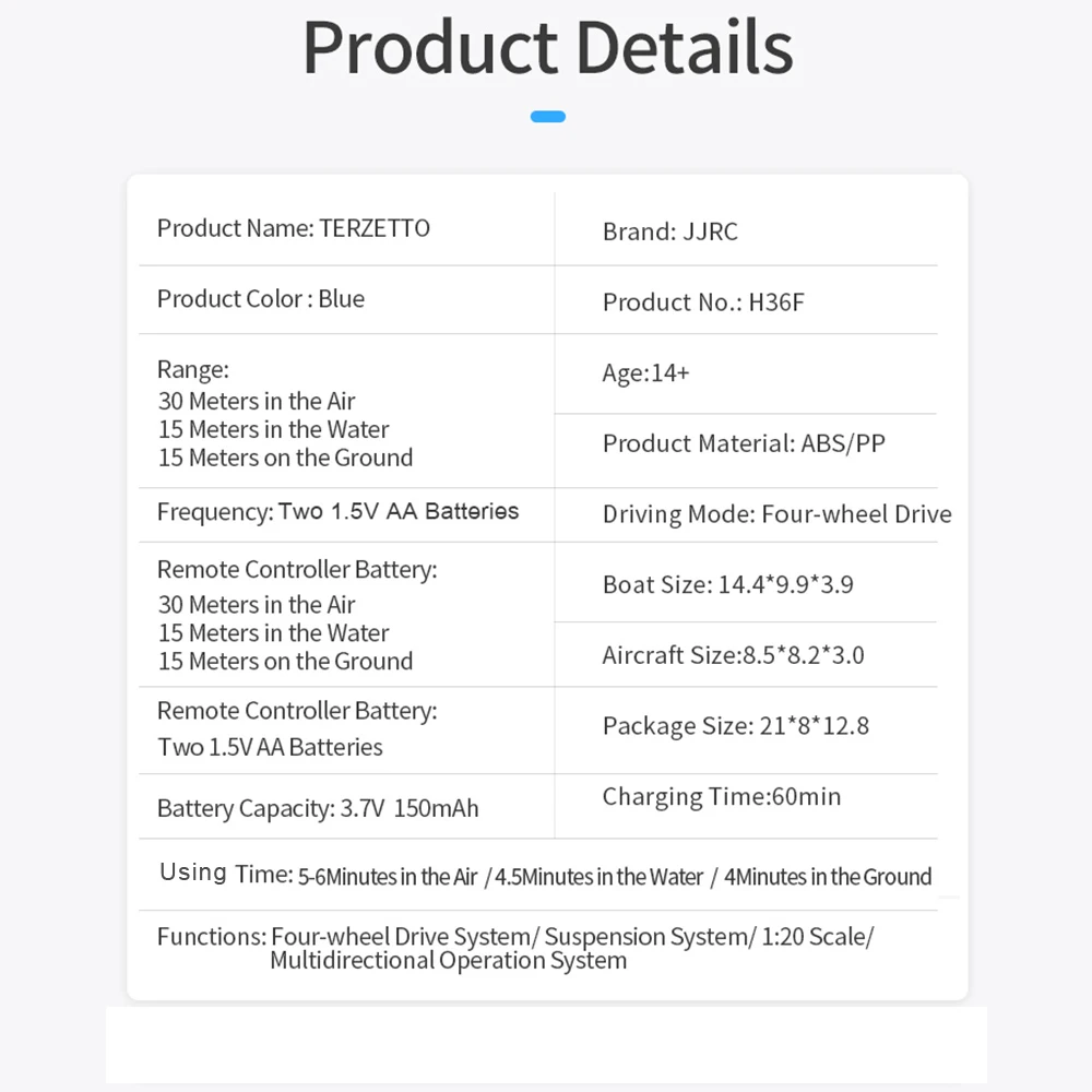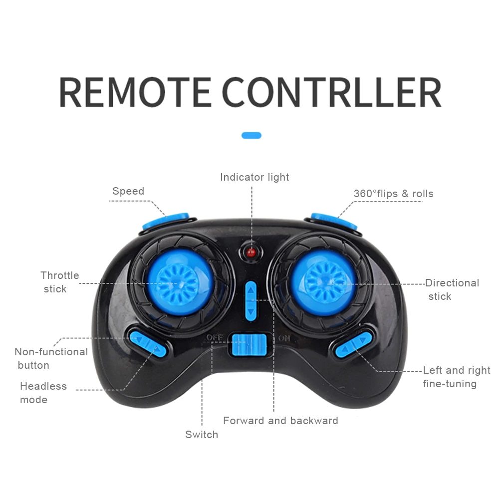 Function: Air Mode: forward and backward, left flight, right flight, left rotation, right rotation, 360°roll function, front and right fine adjustment, headless mode, speed switching.