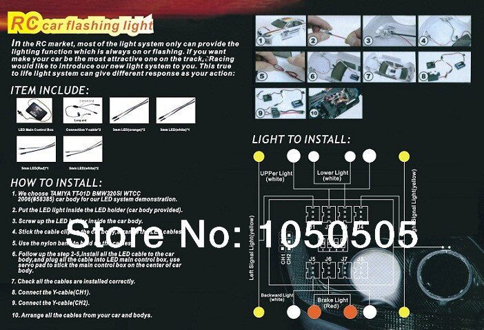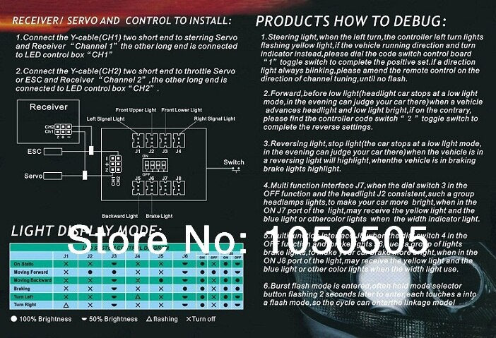 Channel 1 Socket: Use Y-Cable to connect the Steering Servo and Receiver to LED System control box