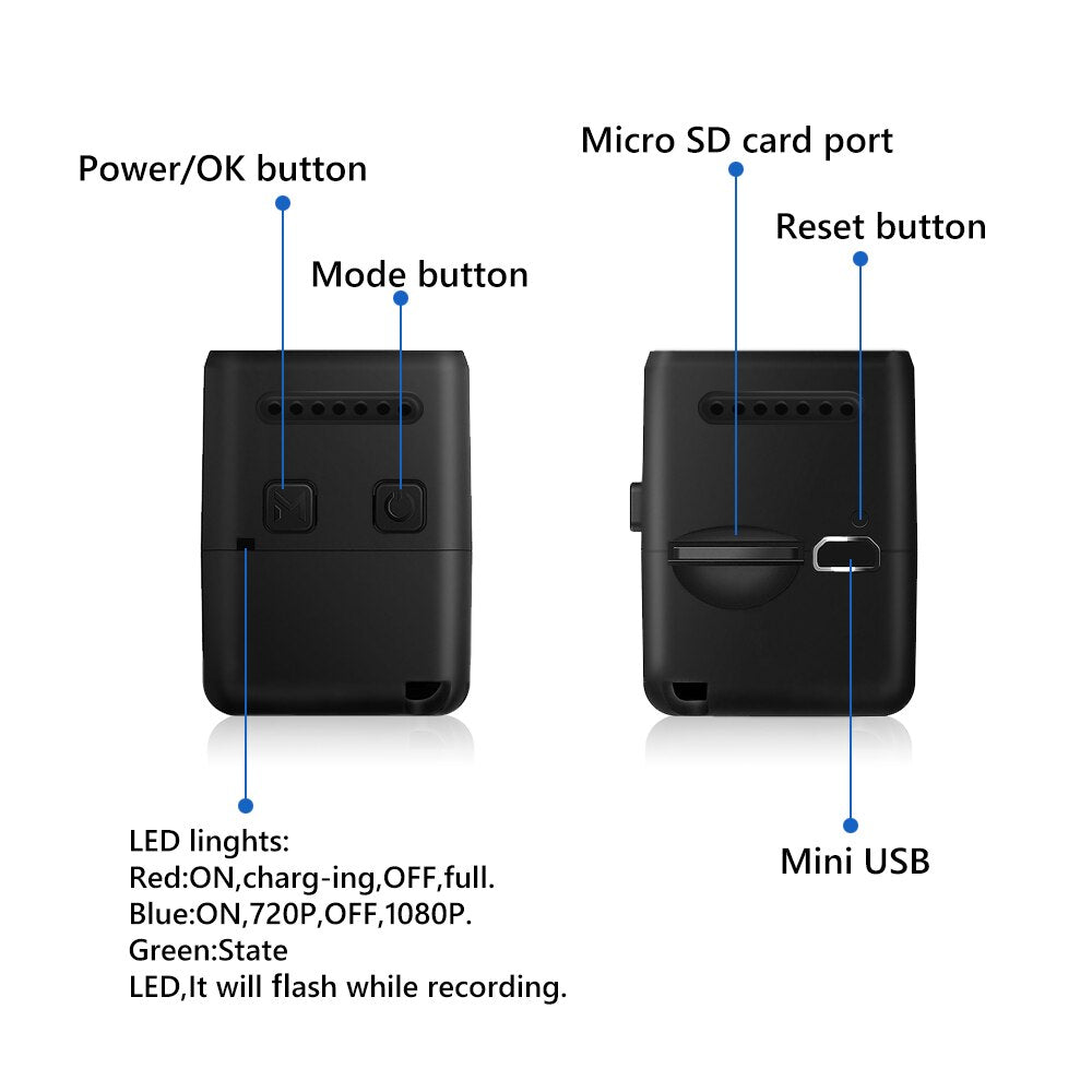 Main Features: ● Image sensor: 2MP ● Video resolution: 1080P / 30fps, 720p / 30fps ● Video record format: MJPG ● Lens: 160 degrees ● AV out: yes ● Storage card: 8 - 32G ● Battery capacity: 200mAh