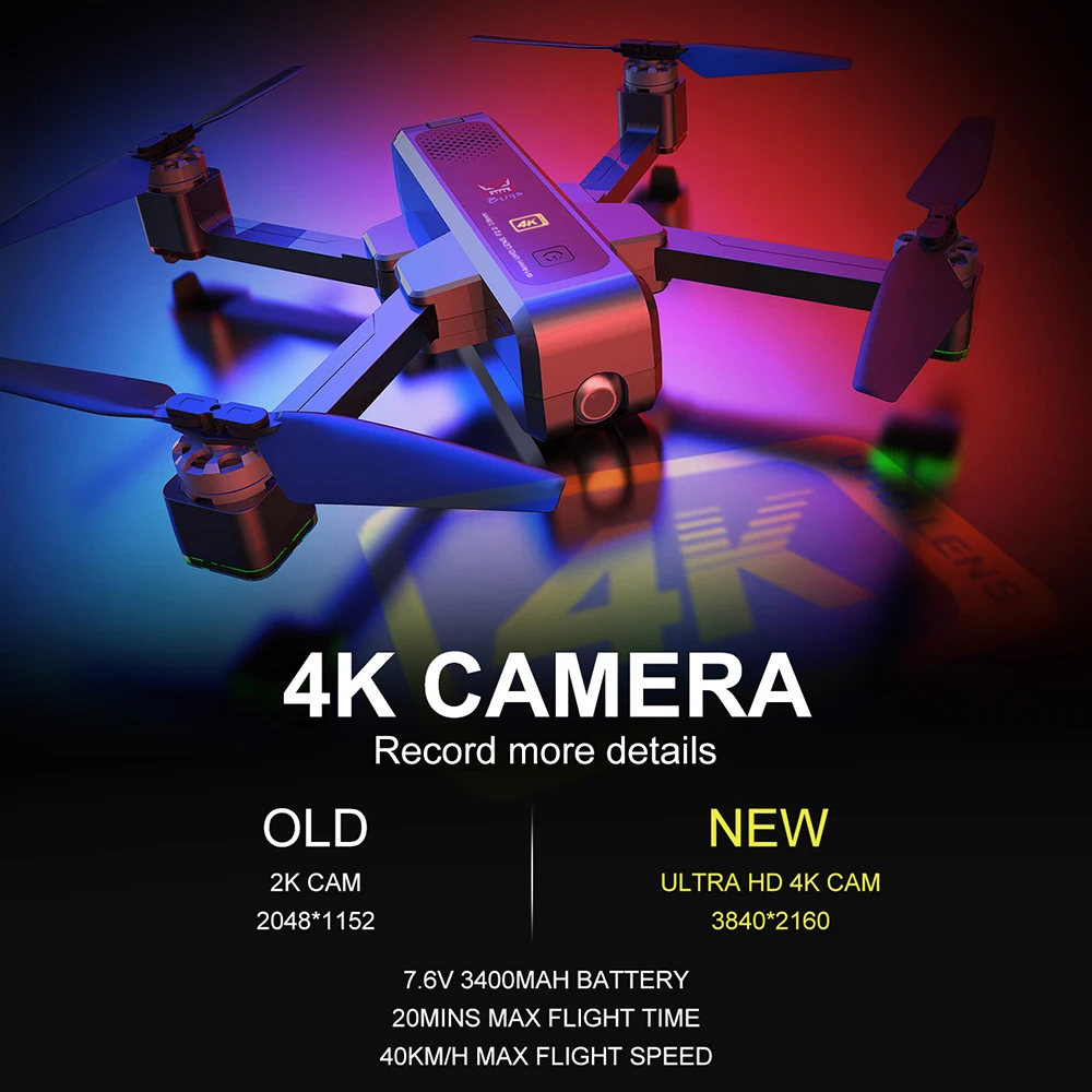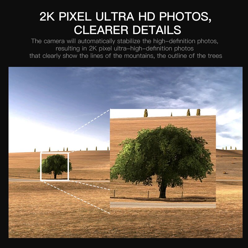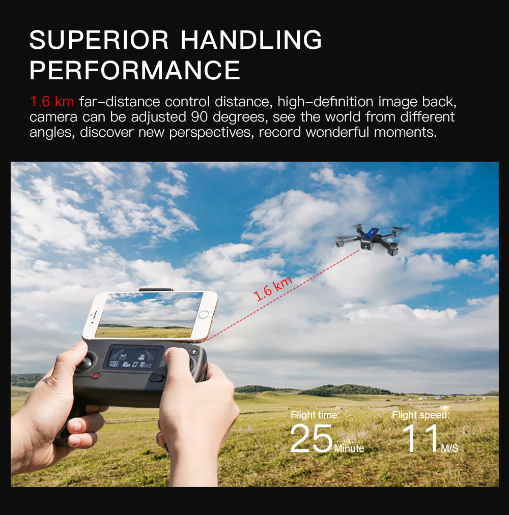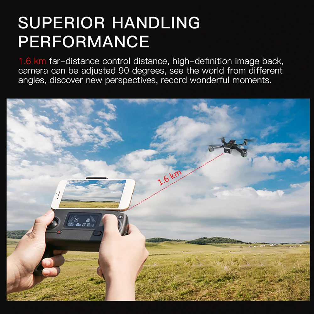 The upgraded camera with 110° FOV (field of view) lens gives a panoramic view for recording your unforgettable moment, to capture pictures and videos from the sky, Adjustable 0°- 90°Pitch angle.