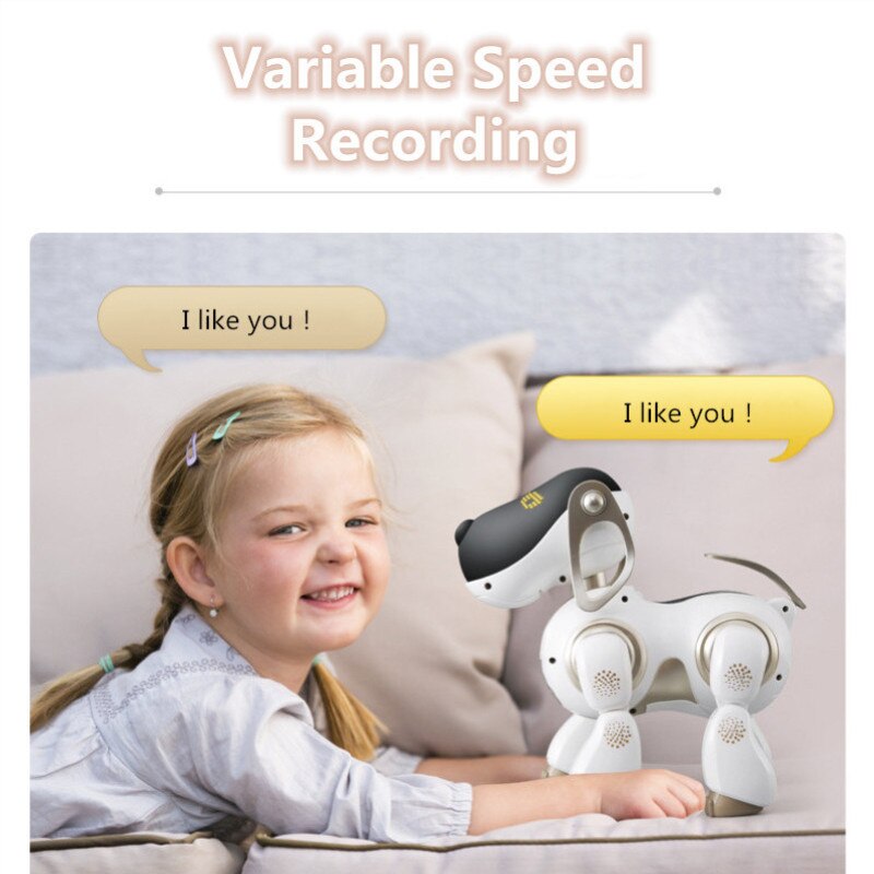 The robot dog has ten different play modes: forward and backward, left and right,sing,dance, intelligent dialogue, dynamic expression,growth teaching,touch function,companion interaction,variable speed recording