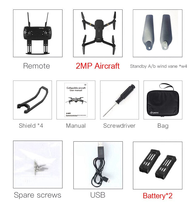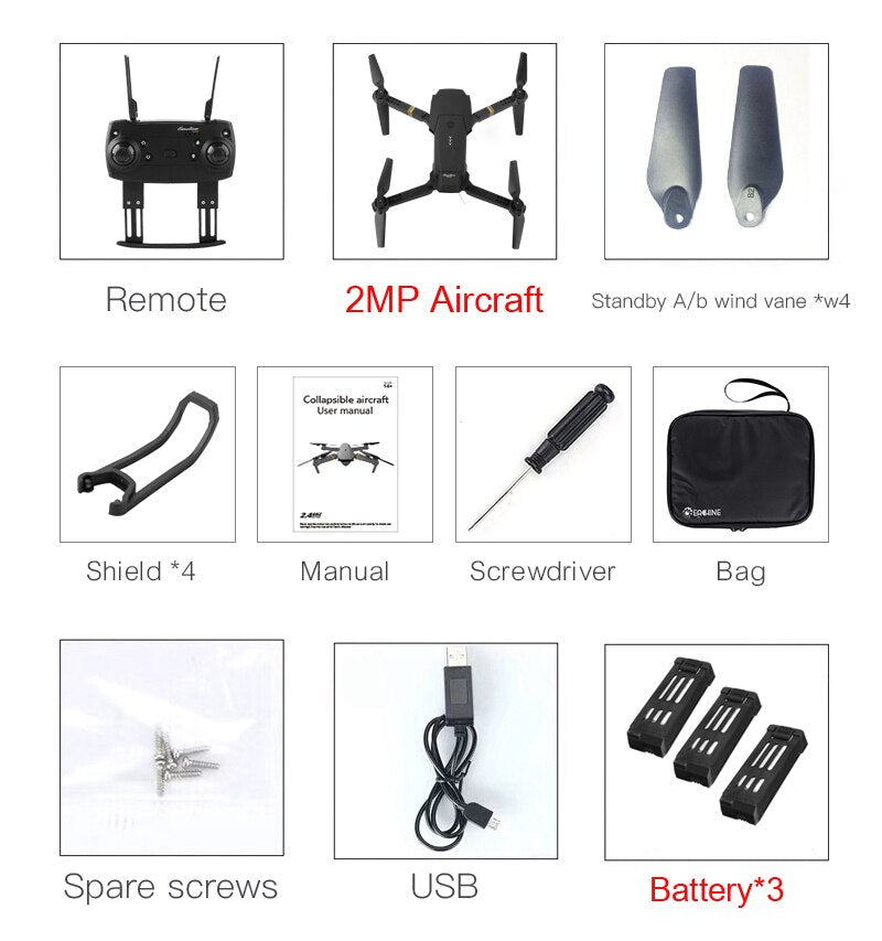 Function: Up/down, Forward/backward, Turn left/right, Sideward flight, 3-level flight speed, LED Light, Headless Mode, One Key Automatic Return, Altitude Hold Mode, WiFi FPV