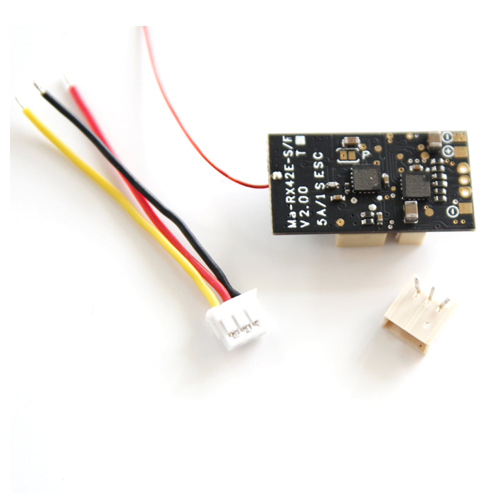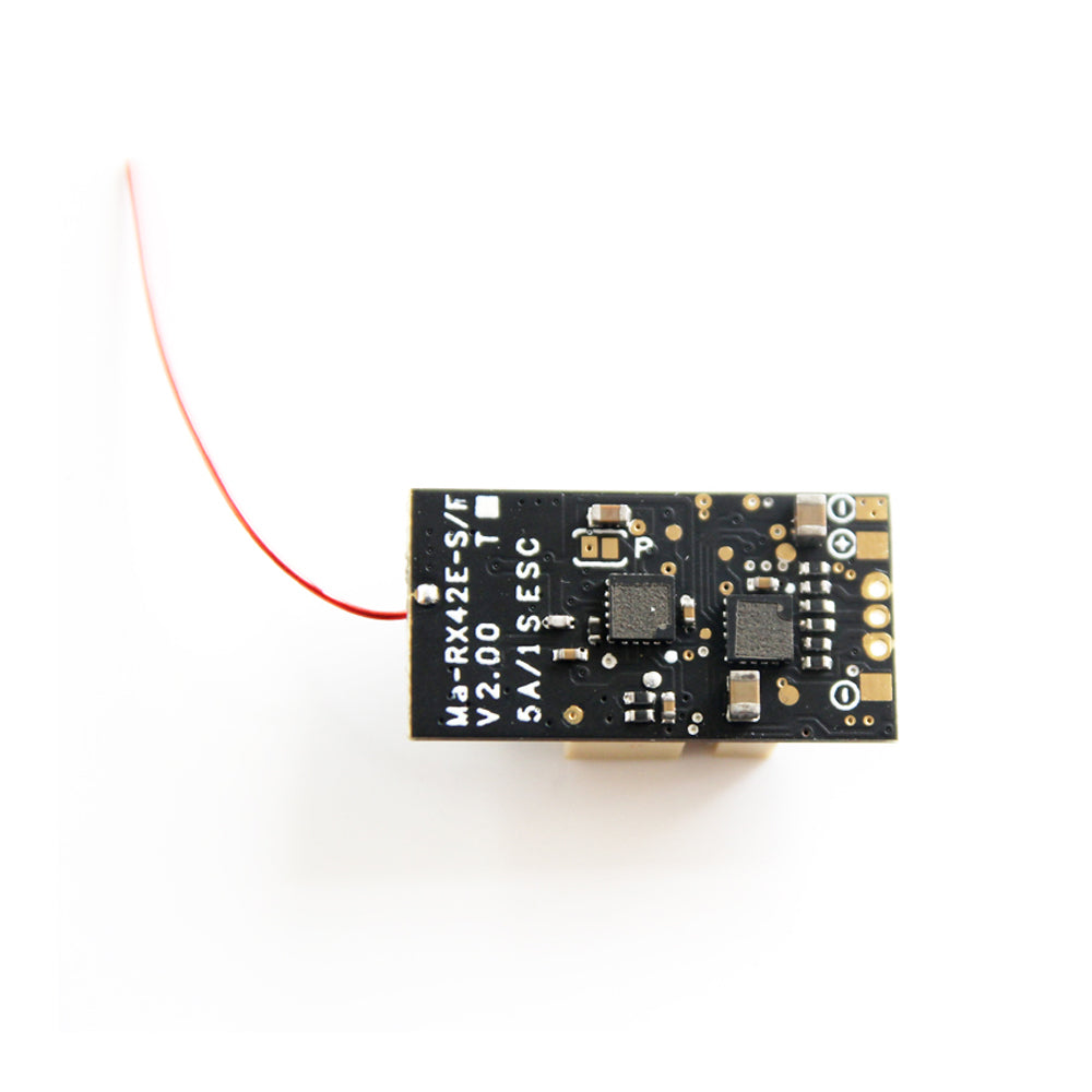 Ma-RX42E-X series receivers are developed on the basis of MA-RX42-X series receiver, it comes with a built-in 5A 1S brushless ESC, but the size is very colse to MA-RX42-X receivers. Customer can change receiver very easily and enjoy brushless flight. Besides, the advance version of MA-RX42E-X series receivers supports TELEM function, in order to tell the difference from the normal versions, one + is added to X of MA-RX42E.