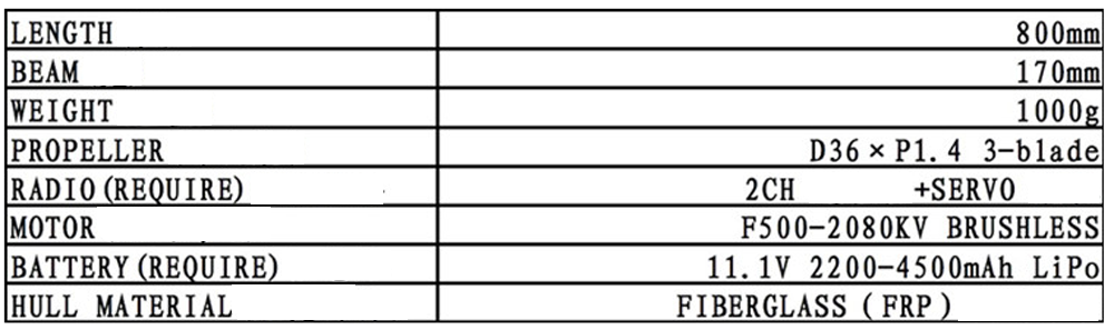 The whole ship without electric control set: FRP hull + 75A water-cooled ESC + F500 brushless motor + standard steering gear
