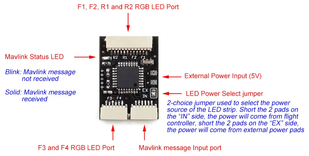 When more than 12 LED beads are used, the telem port of Pixhawk can not supply enough power, so you need power the Mavlink controller from an external 5V source