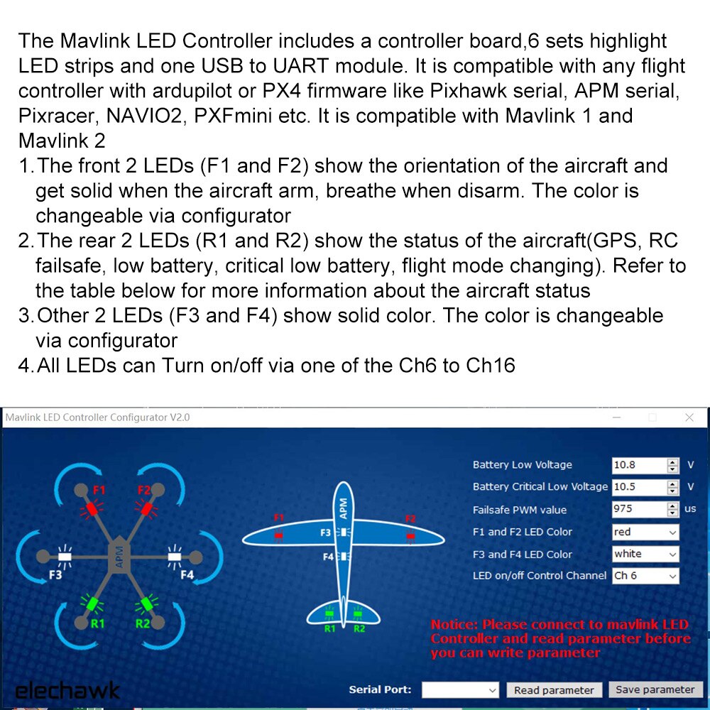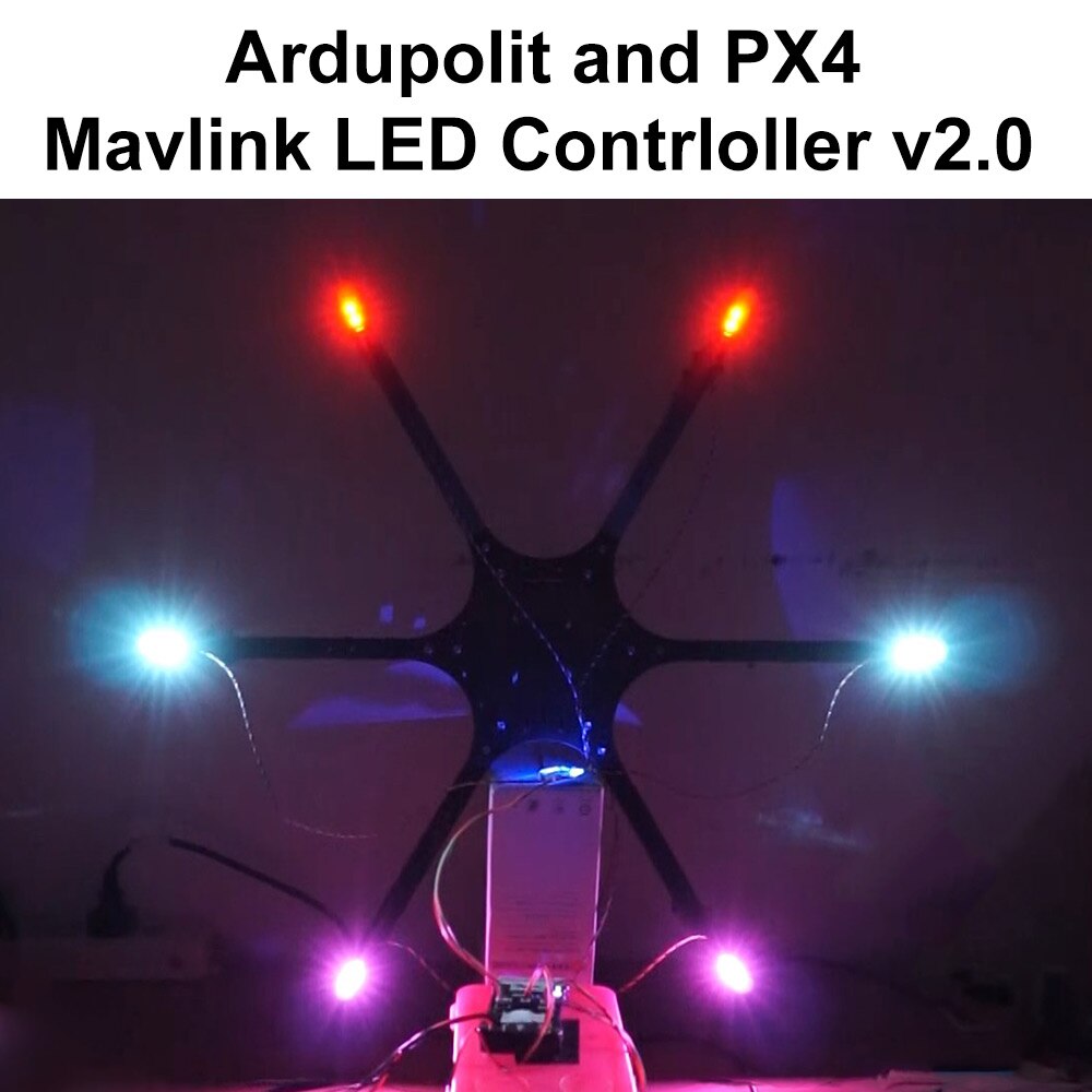 The Mavlink LED Controller includes a controller board, 6 sets highlight LED strips and one USB to UART module. It is compatible with any flight controller with ardupilot or PX4 firmware like Pixhawk serial, APM serial, Pixracer, NAVIO2, PXFmini etc. It is compatible with Mavlink 1 and Mavlink 2