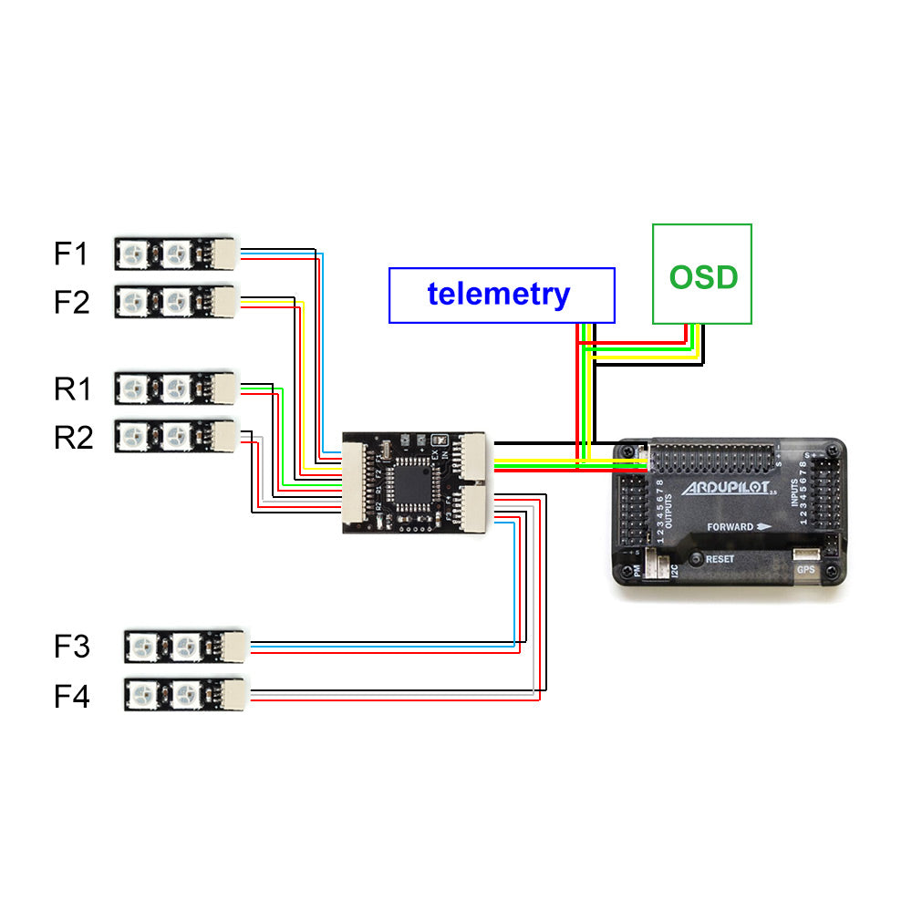 1. The front 2 LEDs (F1 and F2) show the orientation of the aircraft and get solid when the aircraft arm, breathe when disarm. The color is changeable via the configurator