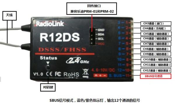 (2) S-BUS signal output working mode:blue/purple LED indicates S-BUS signal output, 12 channels totally.