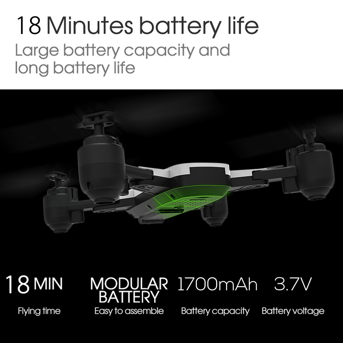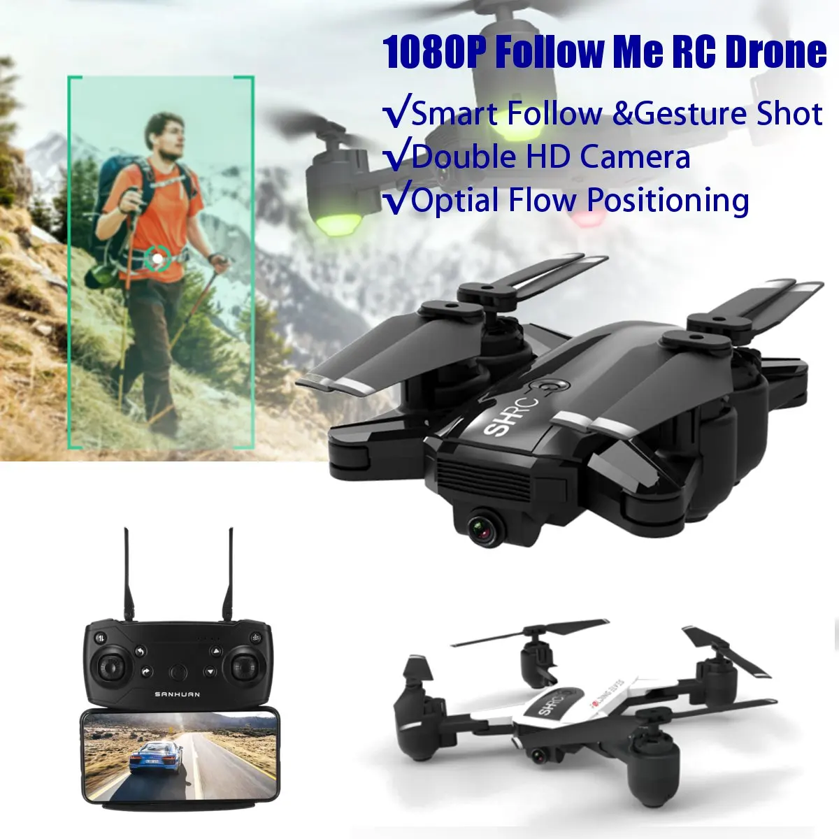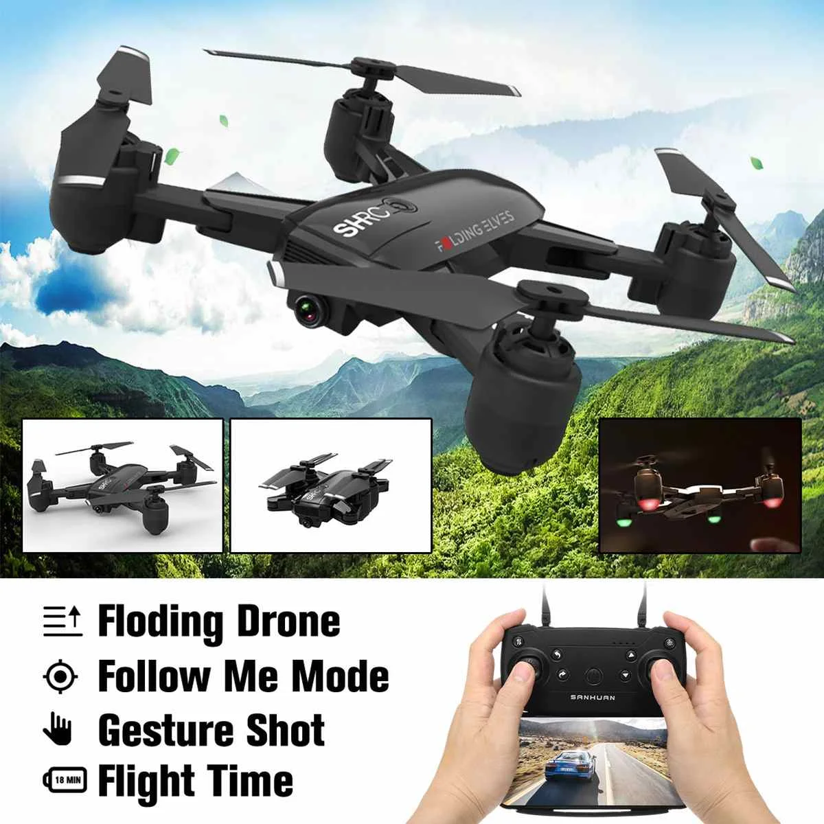 Features: - Folding storage function, foldable and portable, easy to take - Intelligent visual follow: manually locking the target, manually capture the target by intelligent visual tracking system recognition analysis. Achieve follow-up shooting and customize the locked position of the object in the picture - Take photos accoding to gestures: Smart shooting interaction, with deep recognition-based gesture recognition, you can no longer rely on the phone's remote control, just gestures to achieve the shooting function, all these make you feel comfortable with the operation - 18 min long battery life smart module battery, the high-density lithium battery effecively increases the power, bringing up to 18 minutes of flight time, making filght more enjoyable - 1080P HD stable and clear shooting: it has a rich and practical shooting made, equipped with 1080P high-defination camera, you can easily achieve aerial film-style framing, help you shoot large-scale material - Use air pressure to set attitude, control with mobile phone, multi-speed flight, silent flight, portable remote control, inteligent battery, 4 stage wind resistance, etc.
